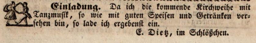 | Beschreibung | Werbeannonce von E. Dietz, Wirt "im Schlößchen", September 1838 | ||