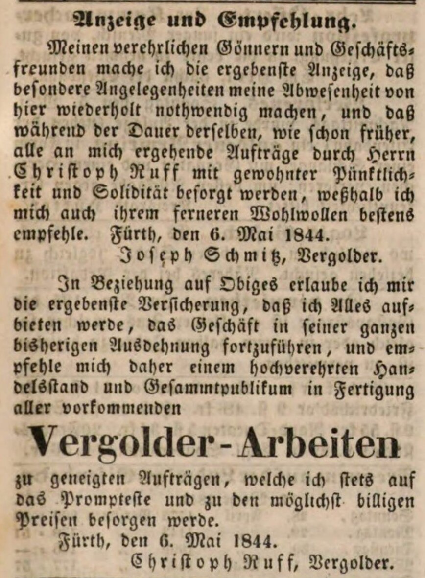 | Beschreibung | Zeitungsanzeige des Vergolders Joseph Schmitz, Mai 1844 | ||
