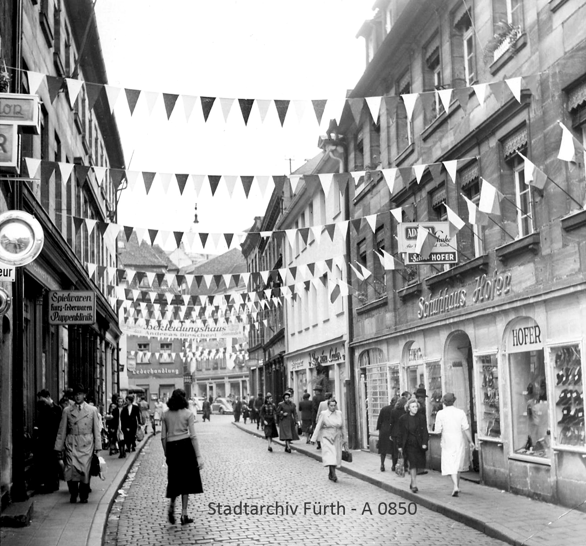 | Beschreibung | Blick in die Ludwig-Erhard-Straße, ca. 1950 – rechts Schuhhaus Hofer | ||