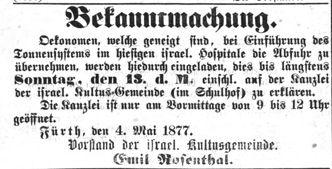 | Dateiinfo (Bild-Unterschrift und Info-Box, automatisch erstellt) | Einführung des Tonnensystems im jüdischen Hospital; Anmeldung Gemeinde-Kanzlei, Schulhof Urheber: Fürther neueste Nachrichten<br>Erstellungsdatum: 8. Mai 1877<br>Lizenz: noc-nc-1.0 | ||