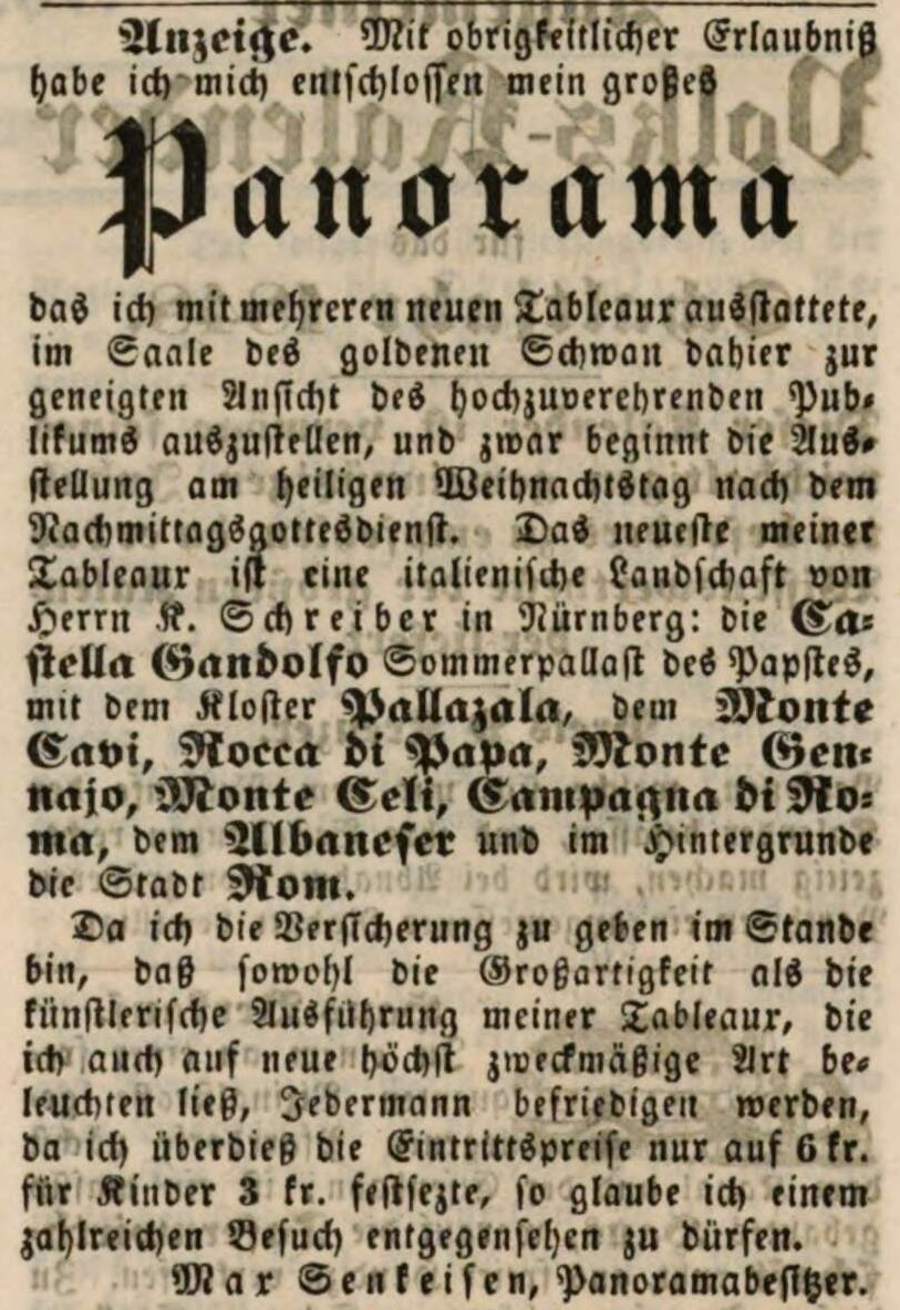BeschreibungZeitungsanzeige des Panorama-Besitzers Max Senkeisen, Dezember 1847