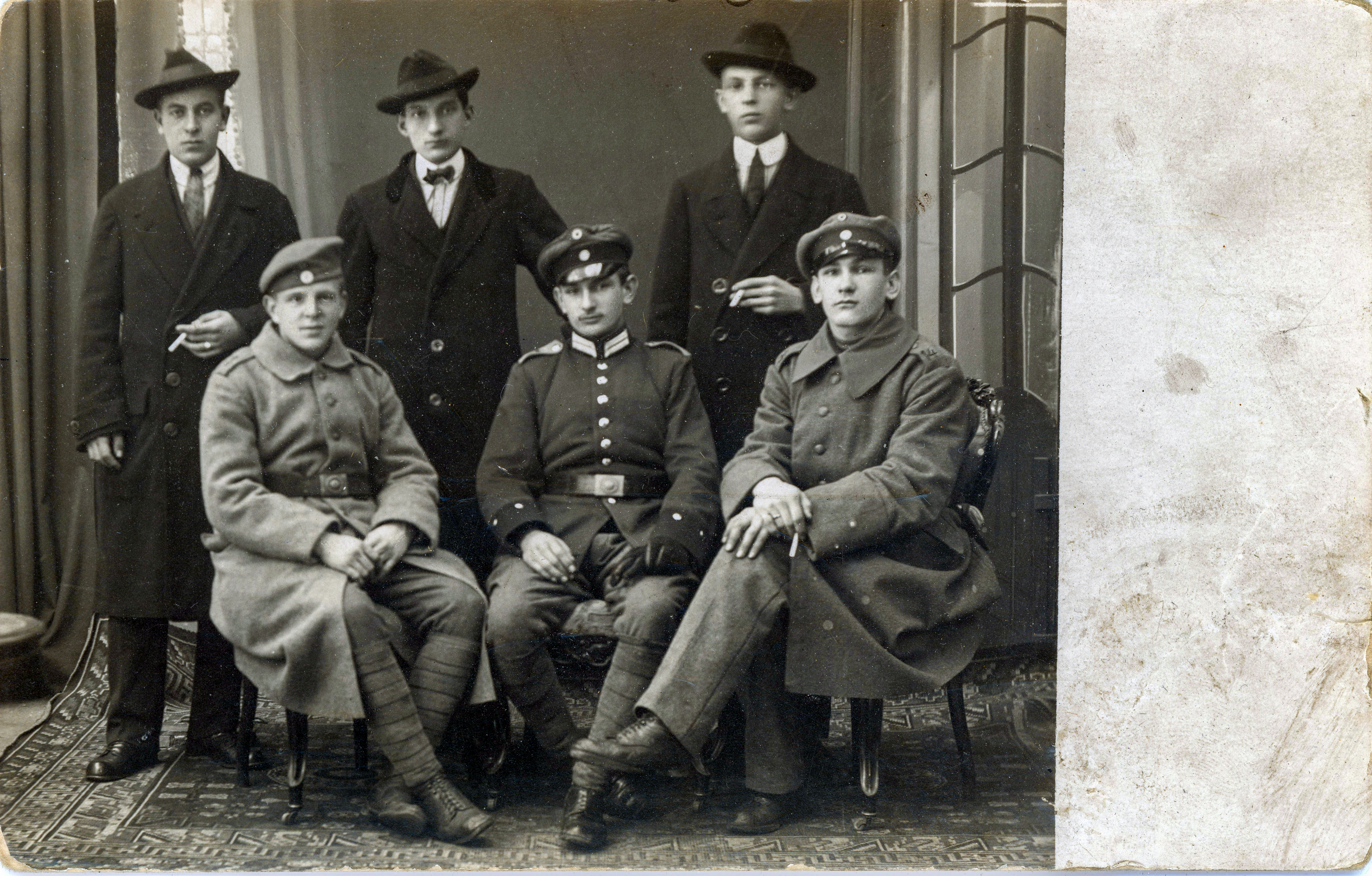 | Beschreibung | Soldaten und junge Männer, ca. 1915 | ||