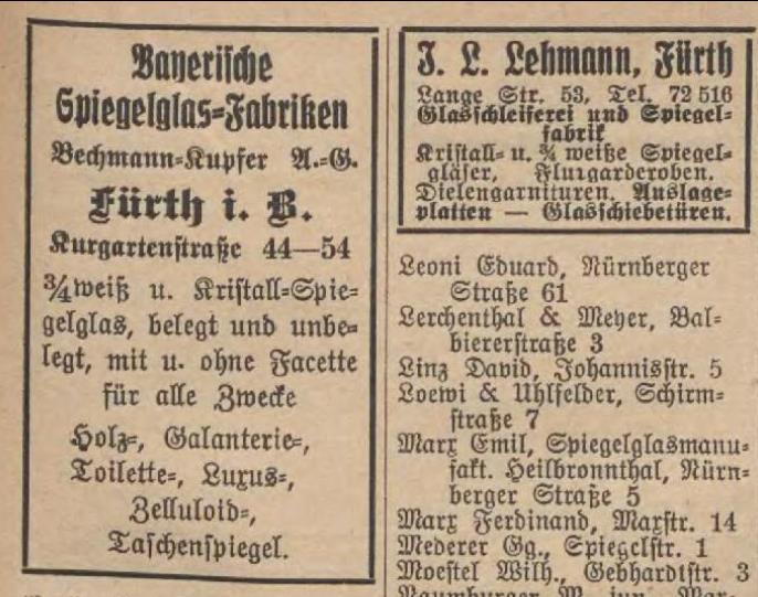 Werbe Eintrag im Fürther Adressbuch von 1931 der Fürther Spiegelglasfabriken unter anderen der Firma Spiegelglashandlung und Spiegelglasfabrik W. Bechmann