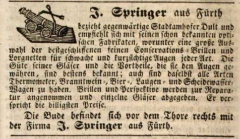 | Dateiinfo (Bild-Unterschrift und Info-Box, automatisch erstellt) | Werbeannonce des Brillenfabrikanten J. Springer, Oktober 1839 Lizenz: noc-nc-1.0 | ||