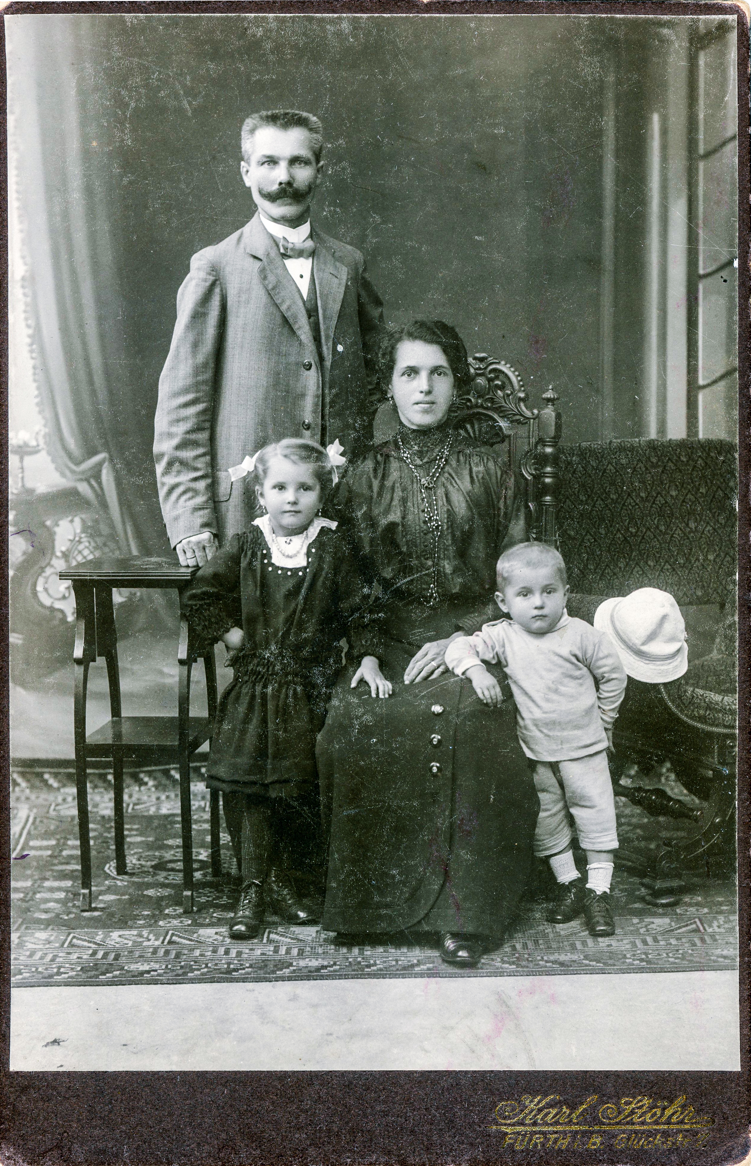 | Beschreibung | Ehepaar im Atelier Stöhr mit zwei Kindern und Hut, ca. 1920 | ||