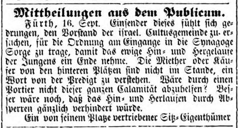 | Dateiinfo (Bild-Unterschrift und Info-Box, automatisch erstellt) | Störung durch Herumlaufen, FAZ 16. September 1865 Urheber: Fürther Abendzeitung<br>Erstellungsdatum: 16. September 1865<br>Lizenz: cc-by-sa-3.0 | ||