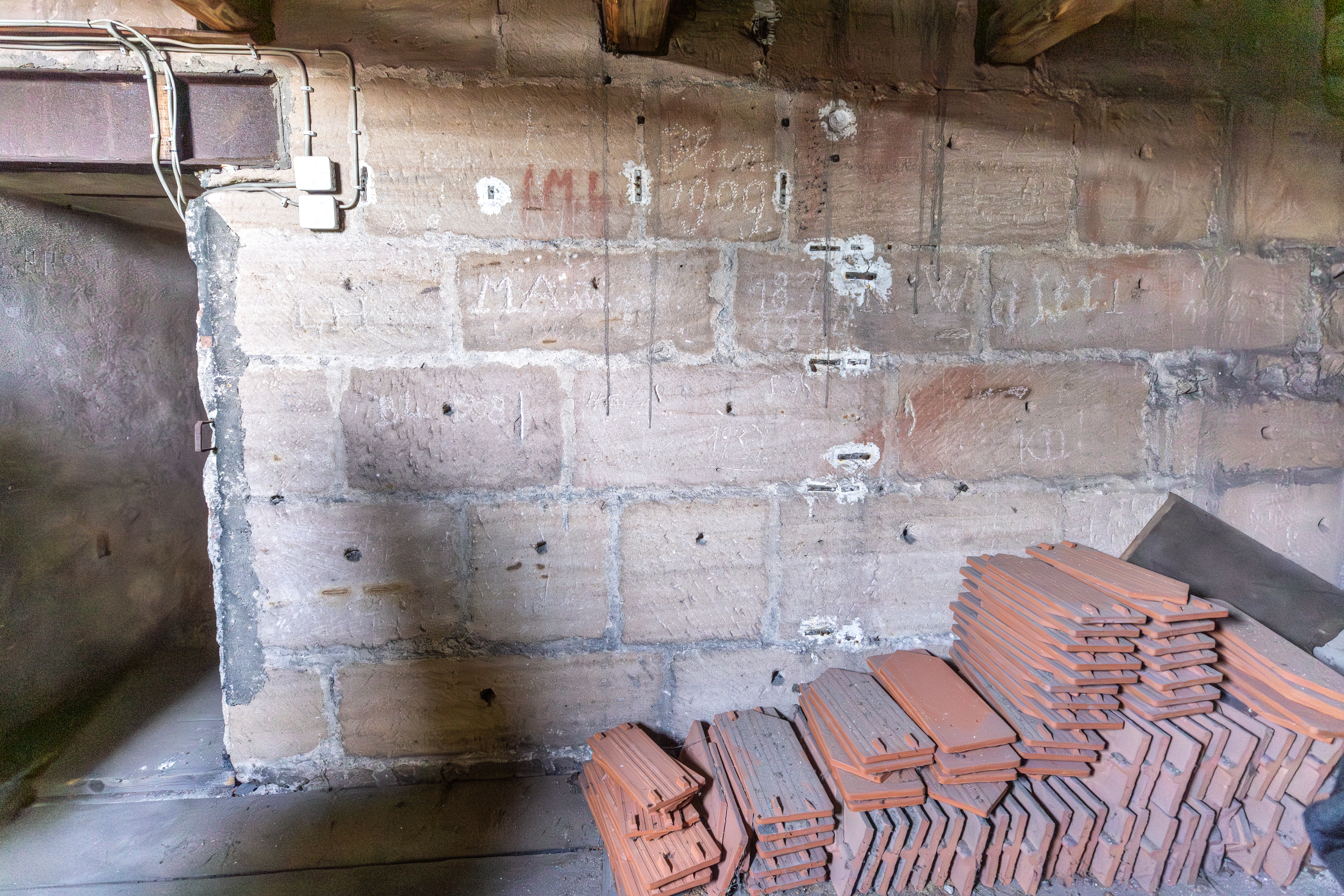| Beschreibung | Schriftzeichen im Kirchturm der St.-Michael-Kirche, März 2026 | ||