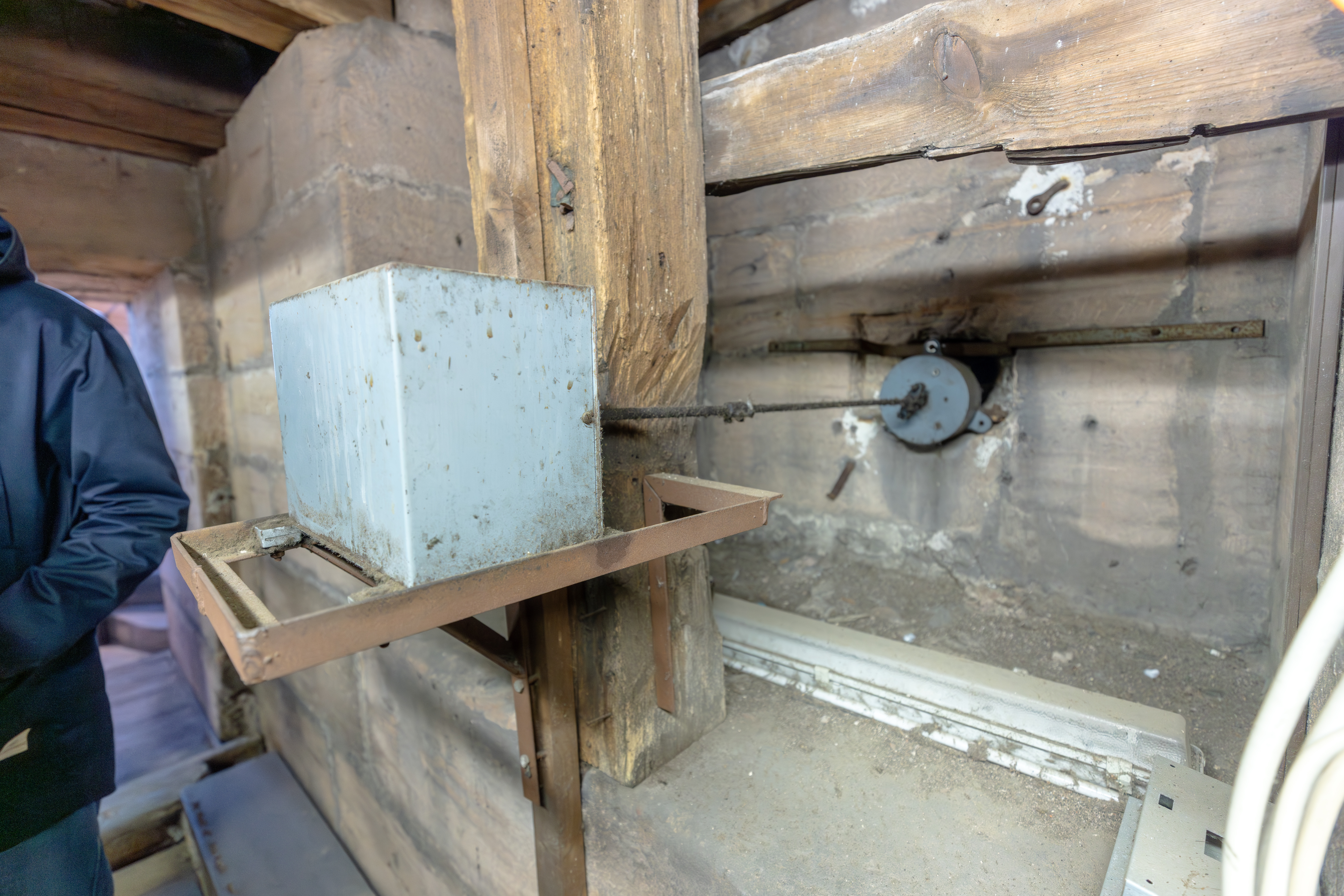Beschreibung Turmuhr mit Übersetzung zu den Uhrzeigern im Kirchturm der St.-Michael-Kirche, März 2026