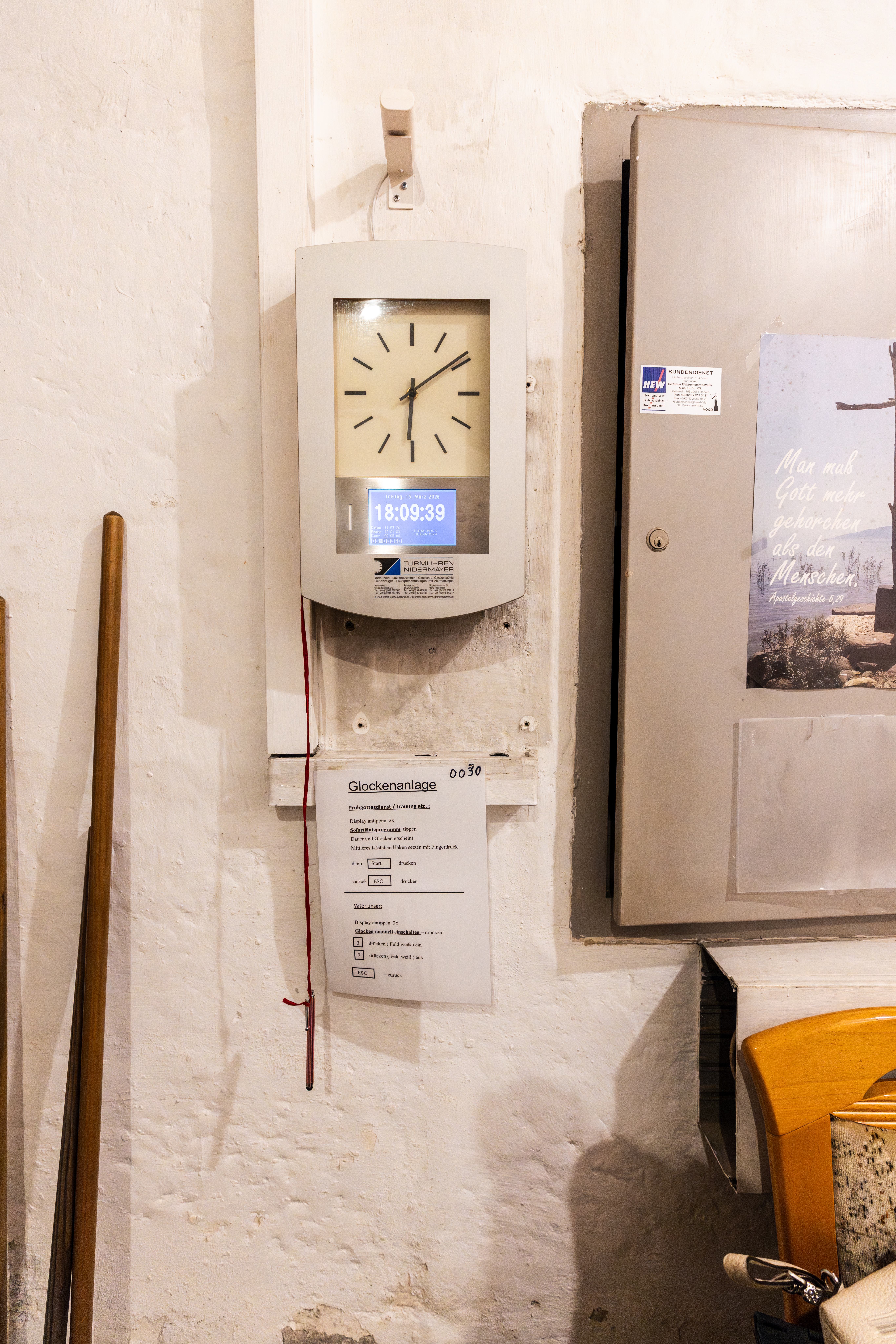 | Beschreibung | Steuereinheit für die Glockenanlage im EG des Kirchturms der St.-Michael-Kirche, März 2026 | ||