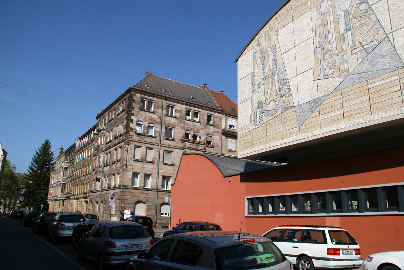 | Beschreibung | Turnstr. 7, Rechts daneben ein Teil der Staatlichen Berufsschule I Fürth mit Wandmosaik "Berufe", 2017 | ||