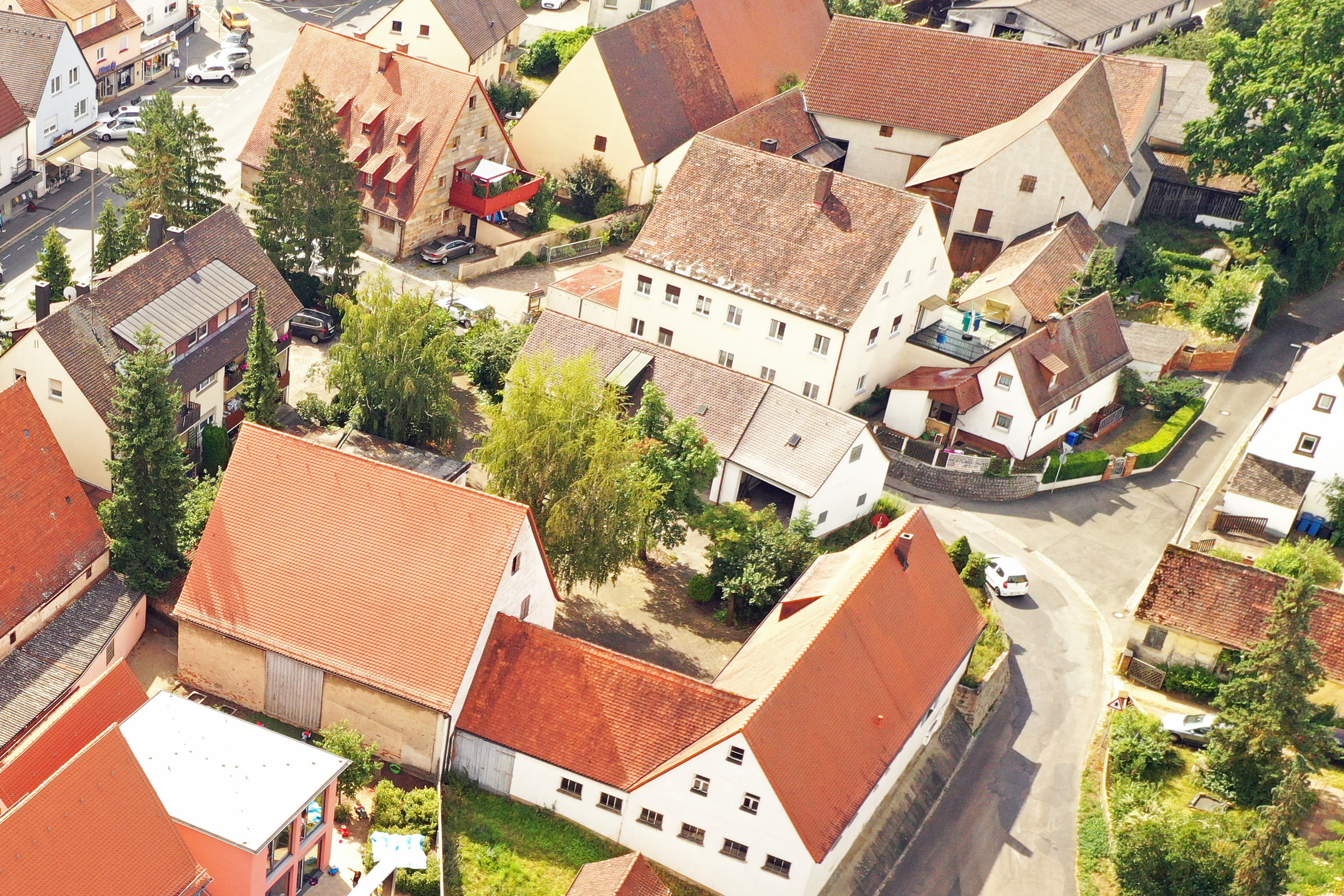 | Beschreibung | Blick auf die Romminggasse in Stadeln, links oben an der Stadelner Hauptstraße das Muggenhöferhaus, Juli 2020 | ||