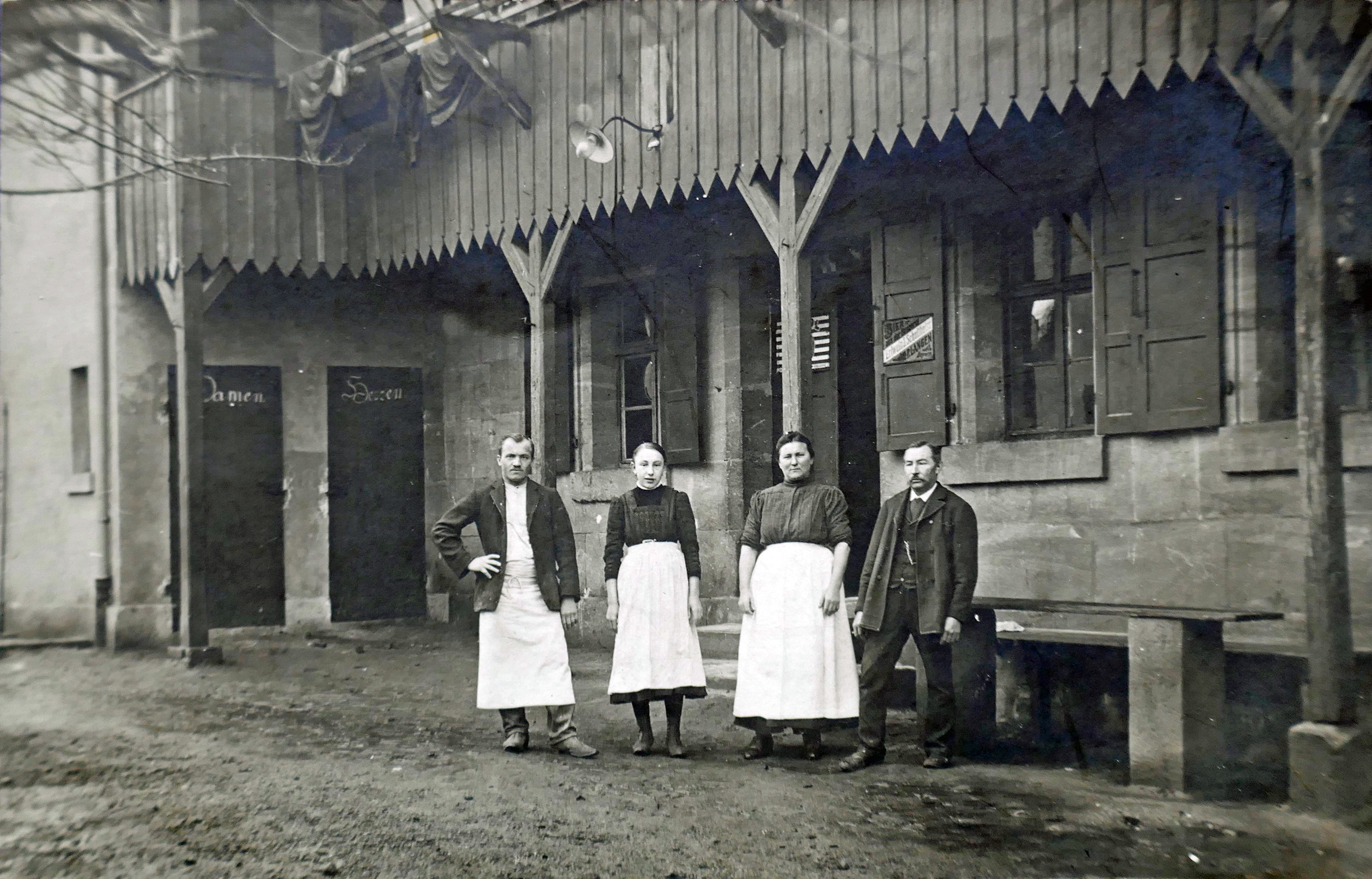 Das genaue Jahr der Aufnahme ist unklar, es könnte auch in den 1930er Jahren sein. In dem Anbau befanden sich laut Zeitzeugen das Stühlelager und evtl. auch eine Kegelbahn.