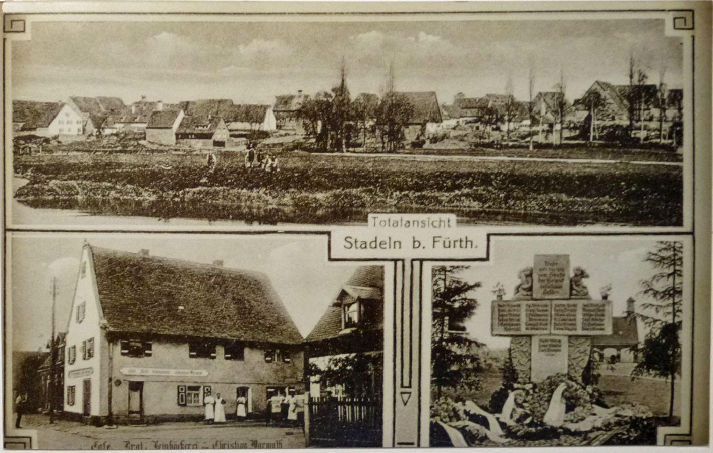 N. Pietsch meint, dass es sich um 1920 handelt, es ist aber schon mit "Warmuth" beschriftet und C. Warmuth kam erst Ende der 1930er Jahre nach Stadeln. Dennoch können Teile der Karte ältere Bilder zeigen.