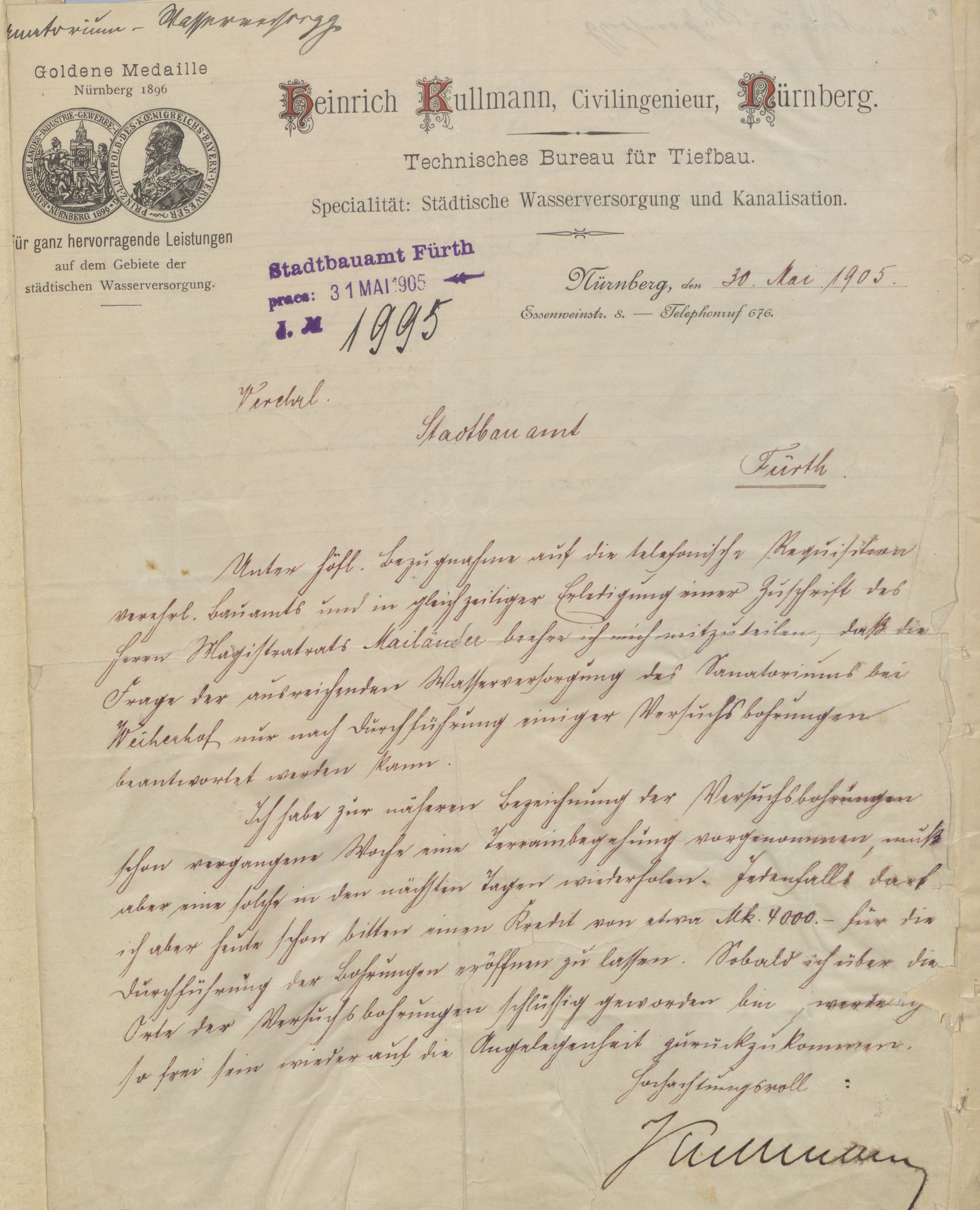 | Beschreibung | Schreiben von Zivilingenieur Heinrich Kullmann an das Stadtbauamt vom 30. Mai 1905 | ||