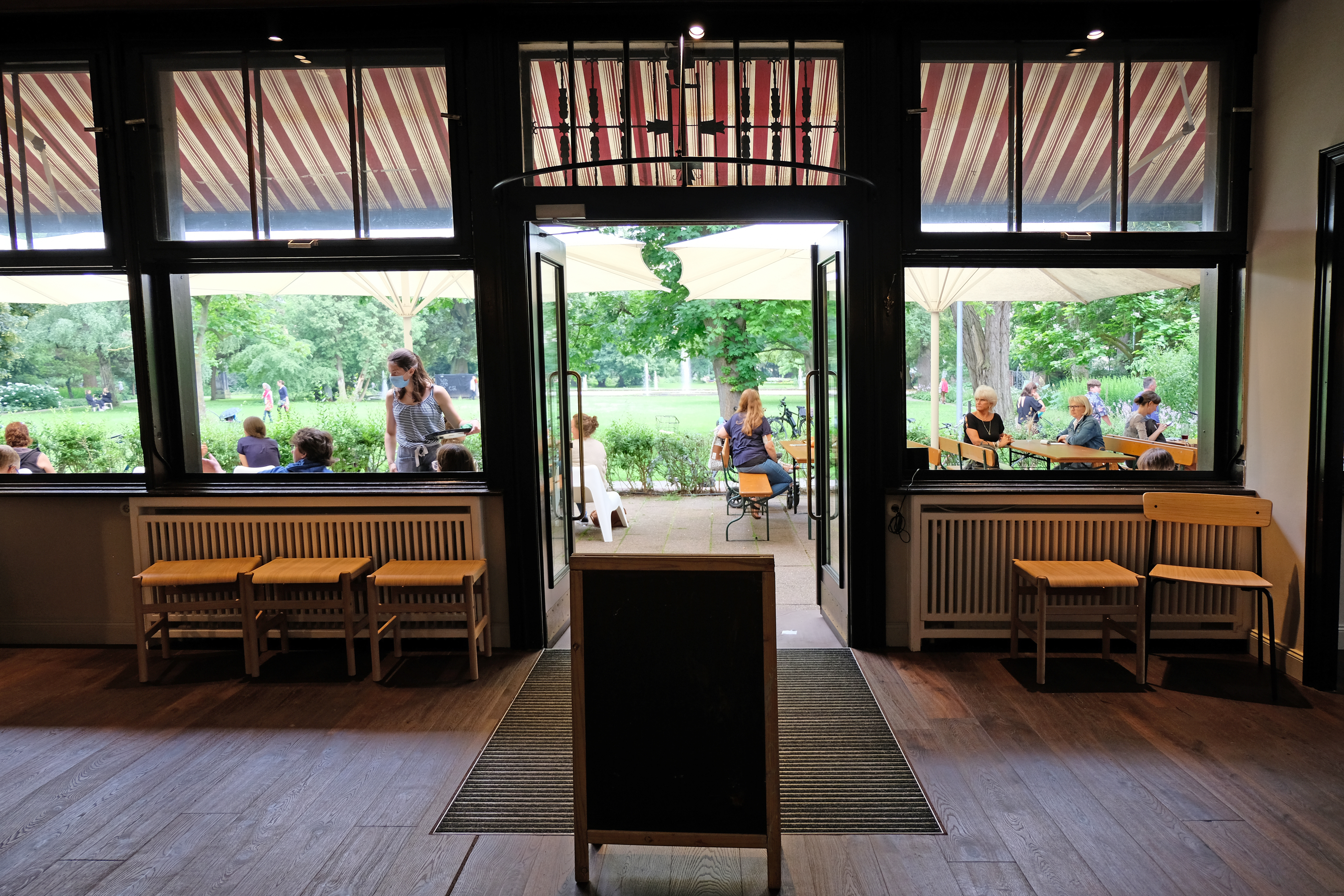 | Beschreibung | Das Stadtparkcafé im Stadtpark mit Blick von Innen nach Außen, Juli 2021 | ||
