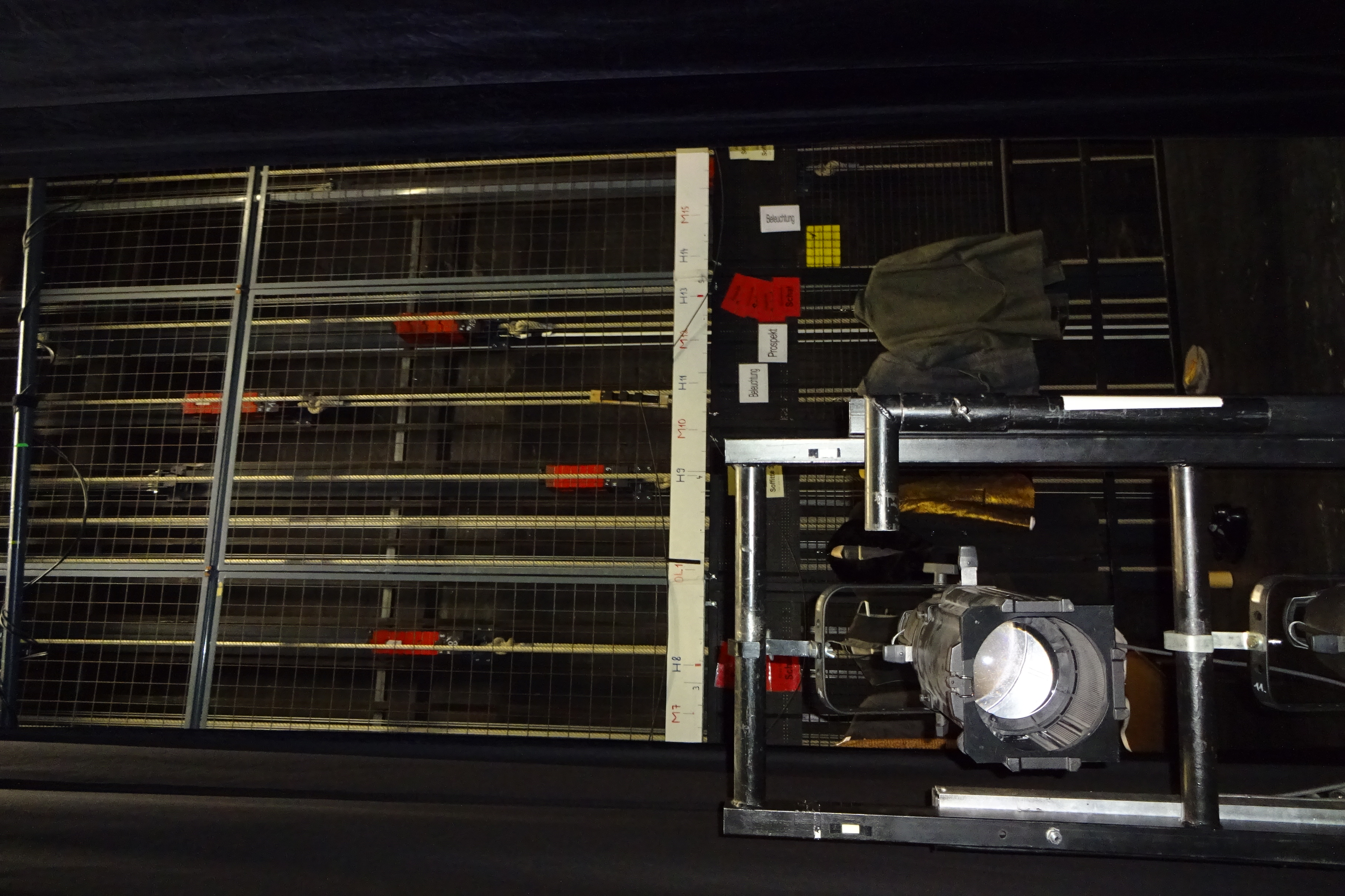 | Beschreibung | Handkonterzüge mit rote Ballastgewichte vom Schnürboden an den Seitenwänden im Bühnenraum, März 2025 | ||