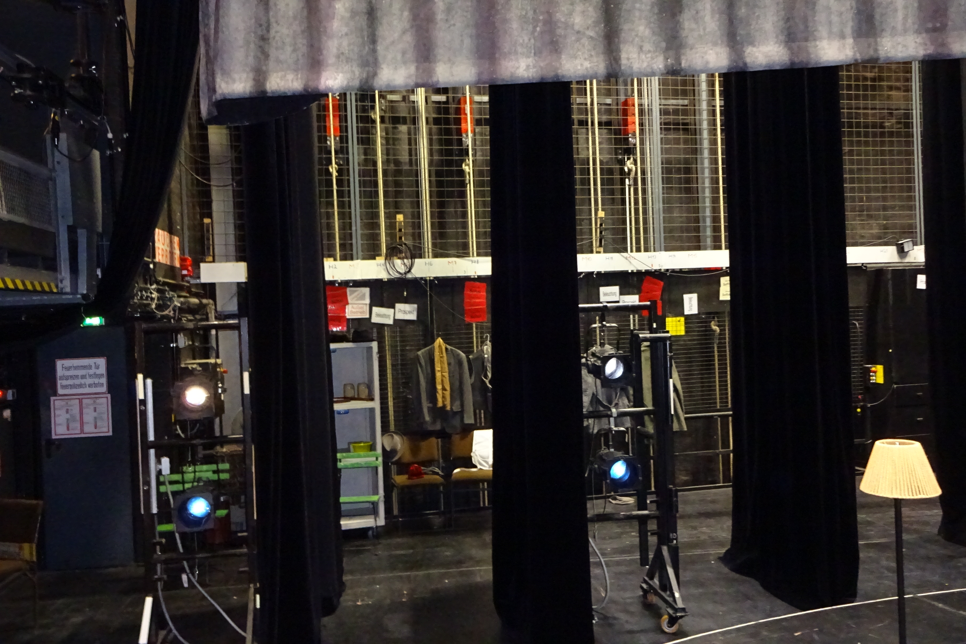 | Beschreibung | Handkonterzüge mit rote Ballastgewichte vom Schnürboden an den Seitenwänden im Bühnenraum, März 2025 | ||