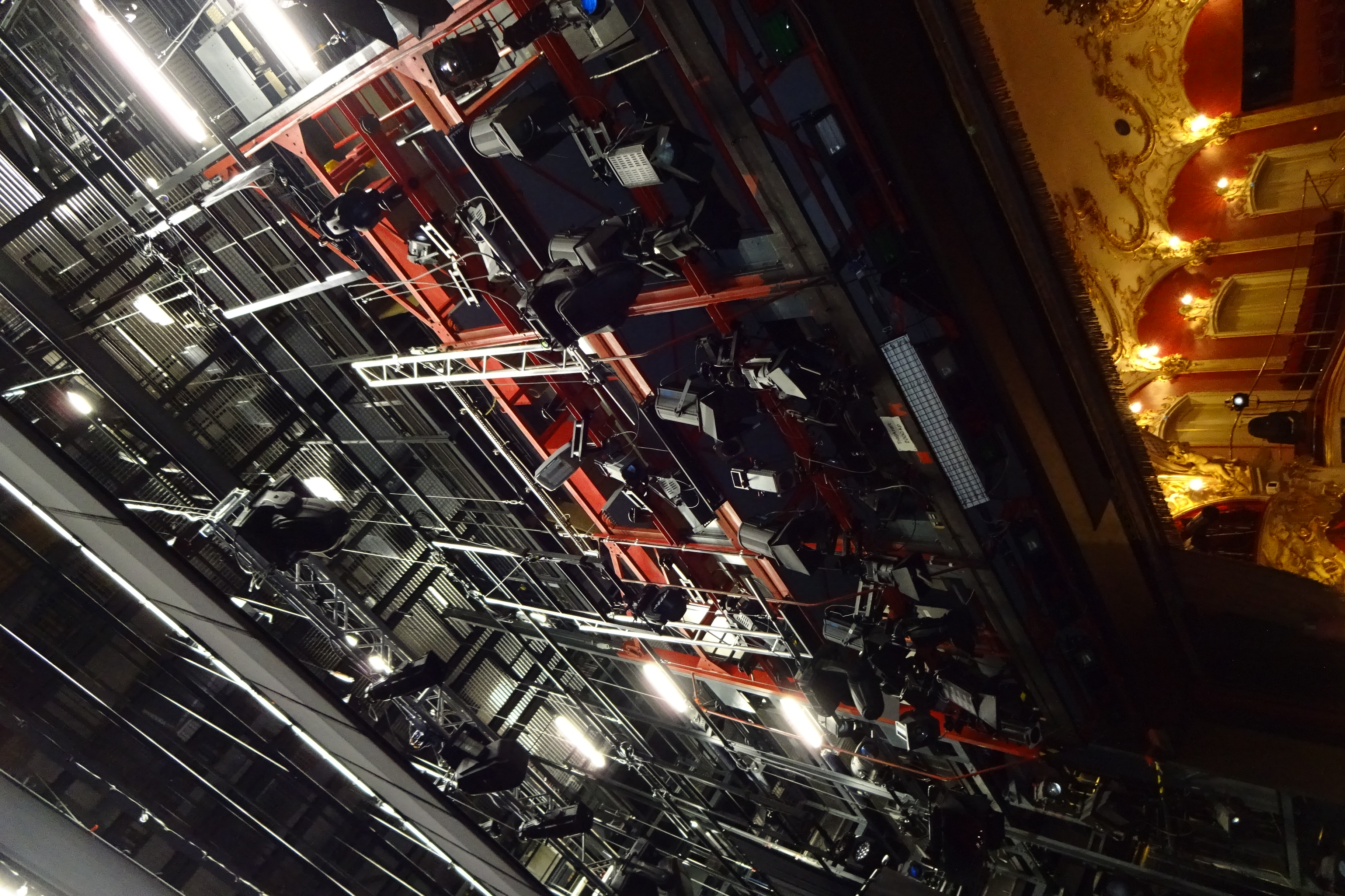 | Beschreibung | Blick über das Bühnenportal in die "Obermaschinerie" Technik mit Beleuchtungsbrücken, Laufgitter, Schnürboden usw. im März 2025 | ||