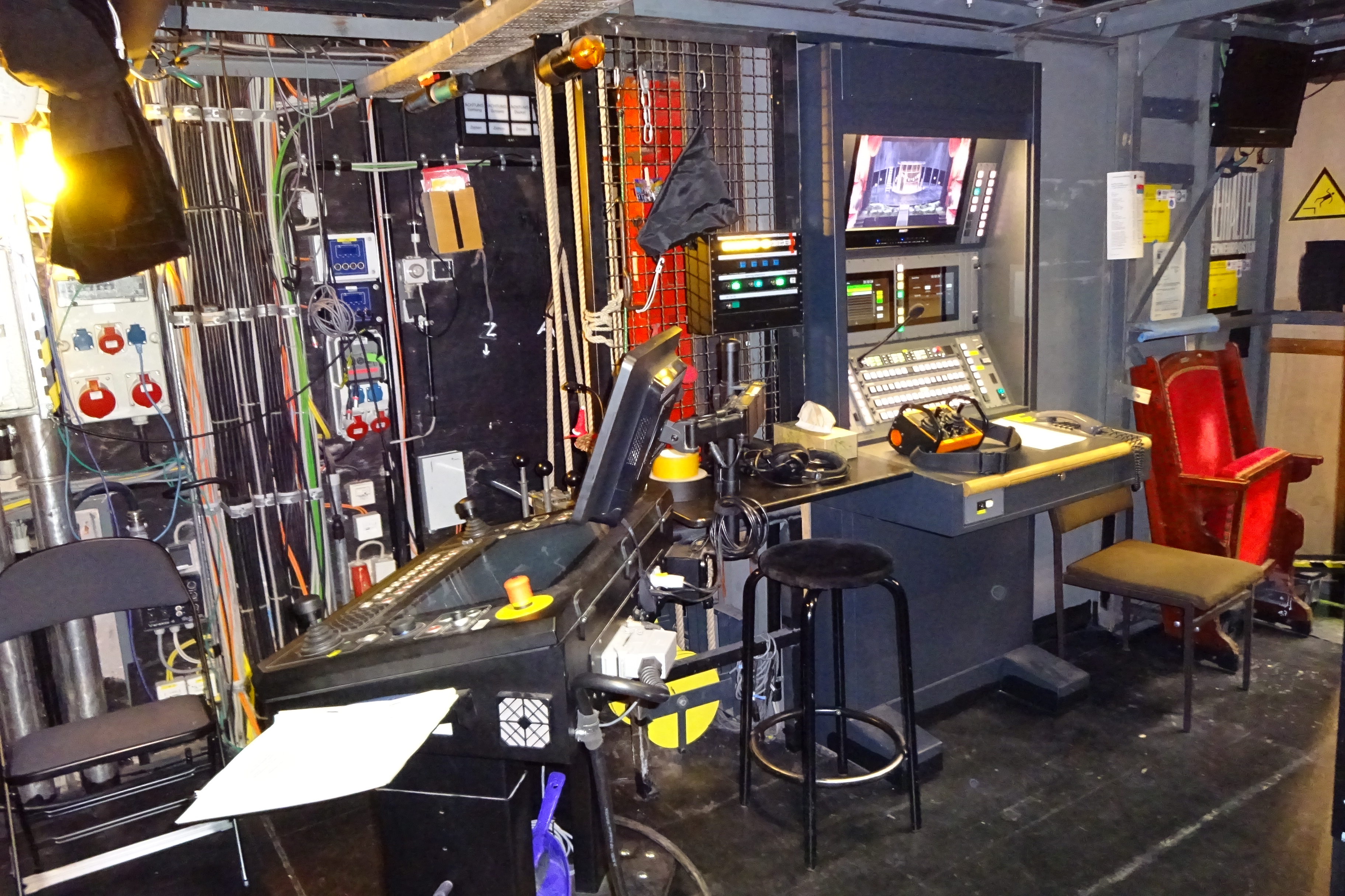 | Beschreibung | Bühnen- und Lichtechnik Arbeitsplätze, rechts der rote Sessel für den zweiten Feuerwehrposten, daneben Richtung Bühnenportal zum Zuschauerraum, März 2025 | ||