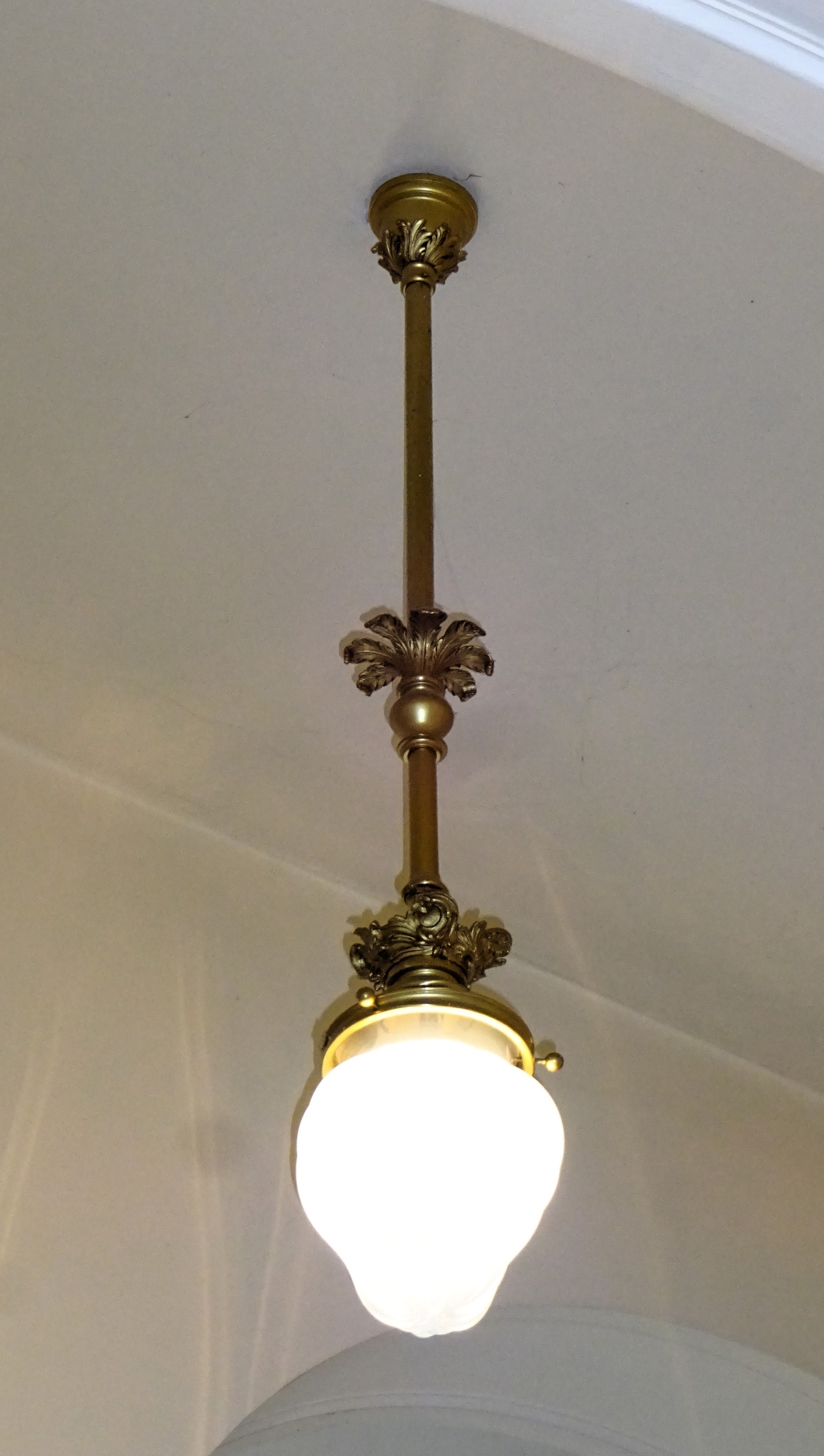 | Beschreibung | Leuchte aus der Gründerzeit, Messingguss und böhmisches, mundgeblasenes Glas, Aufnahmem März 2025 | ||