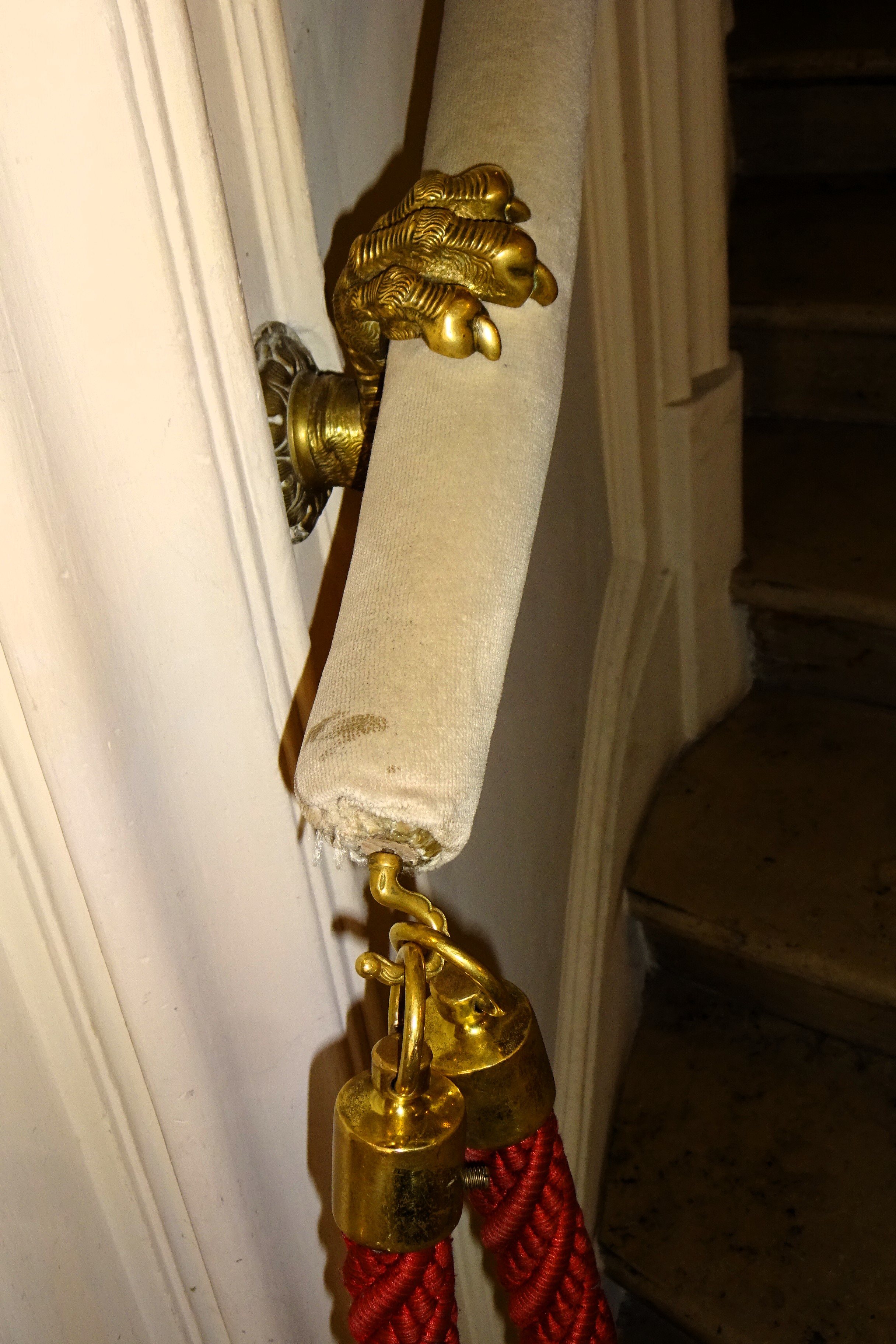 | Beschreibung | Absperrkordel und Messing Raubvogelkralle Halterung des stoffüberzogenen Handlaufes im Stadttheater, März 2025 | ||