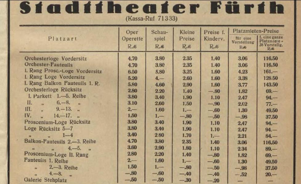 Werbe Eintrag im Fürther Adressbuch 1931 vom Stadttheater mit Eintrittspreise Übersicht