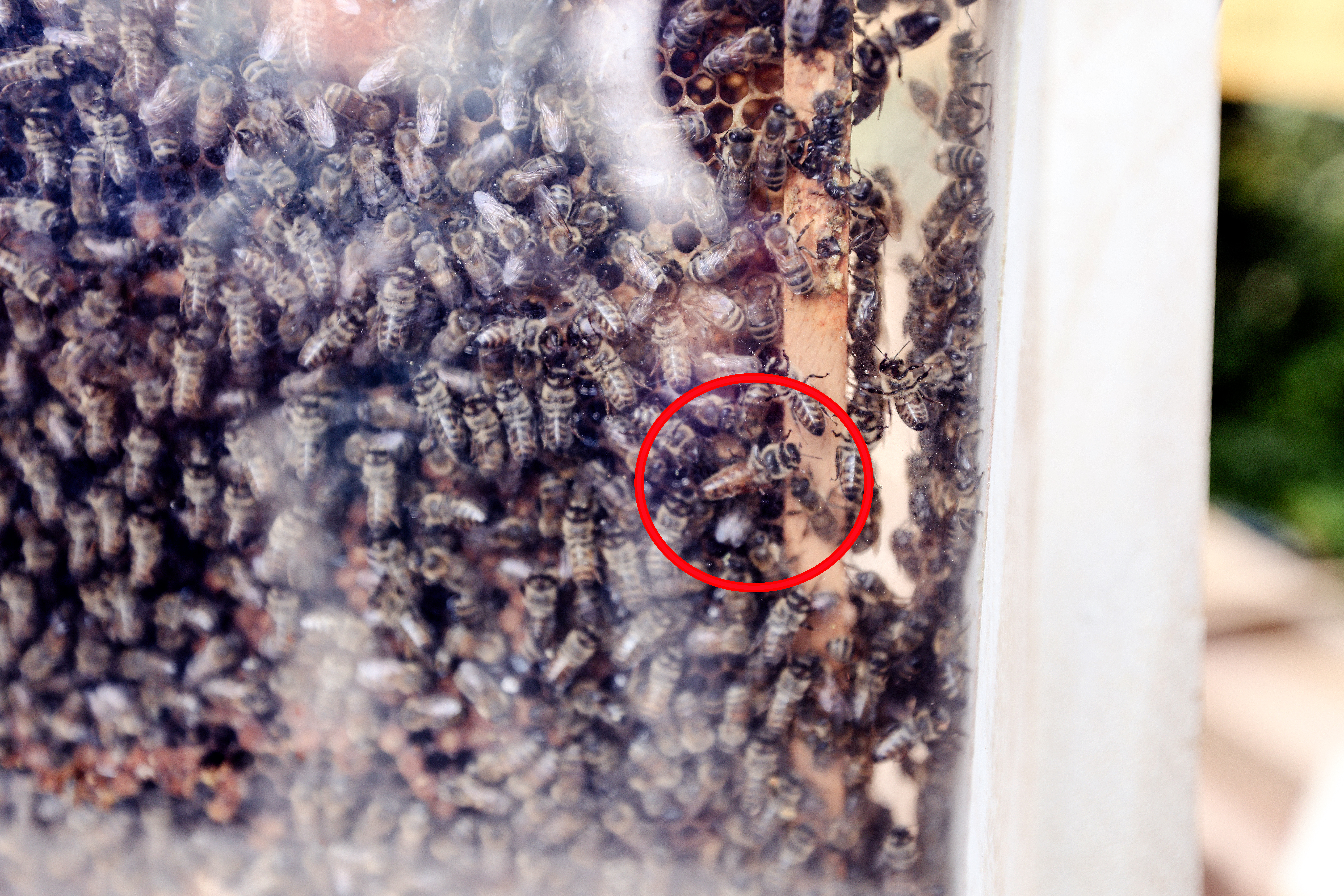 | Beschreibung | Blick in einen Bienenstock mit königlichem Besuch - im roten Kreis die Bienenkönigin, Sept. 2023 | ||