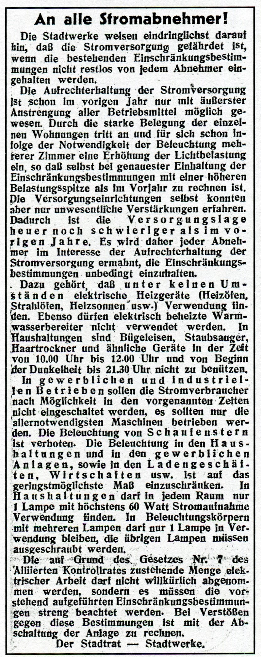 Stadtwerke Stromsperre Ankündigung im Amtsblatt der Stadt Fürth Sept. 1946