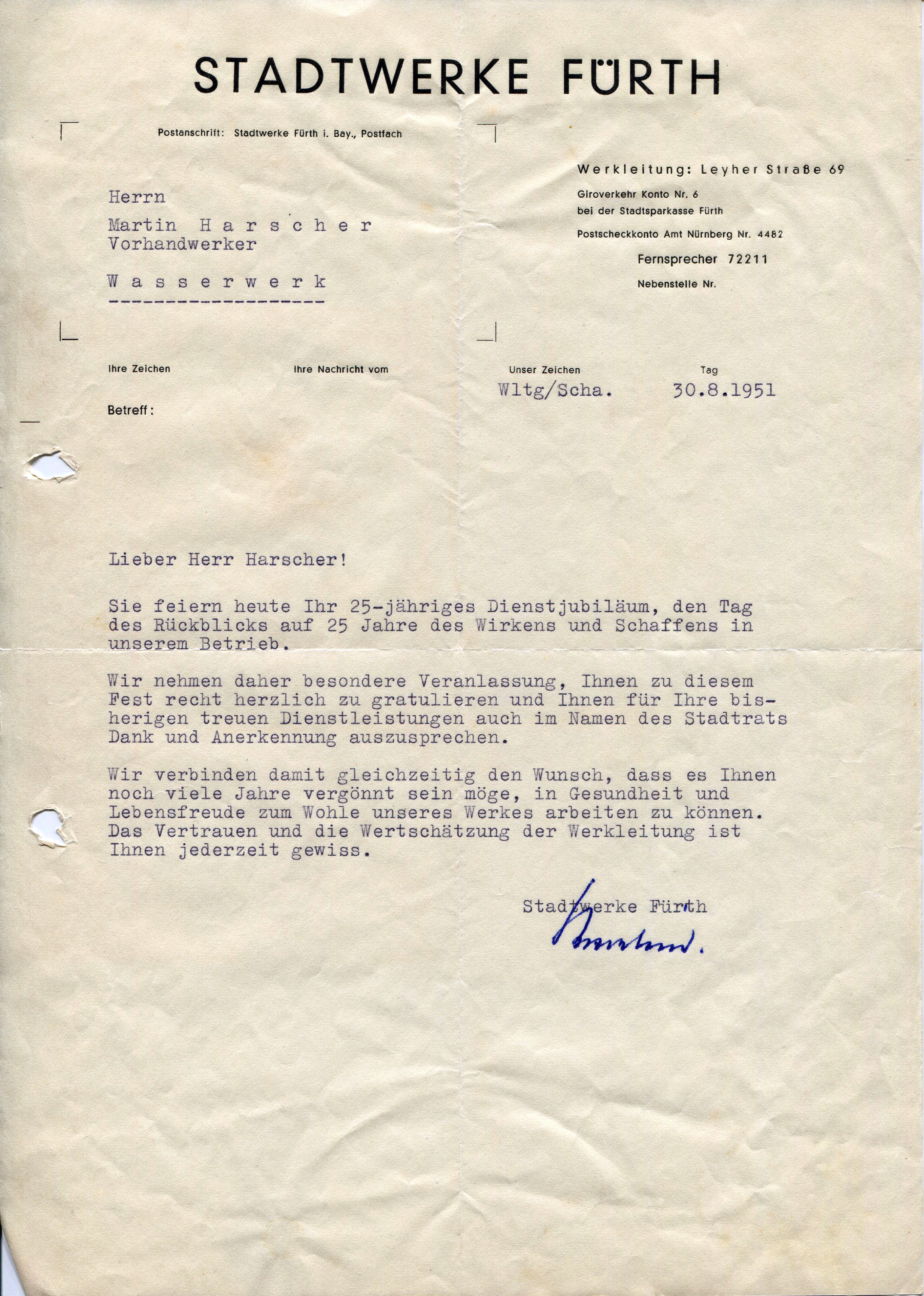 | Beschreibung | 25-jähriges Dienstjubiläum bei den Stadtwerken Fürth für Martin Harscher, 1951 | ||