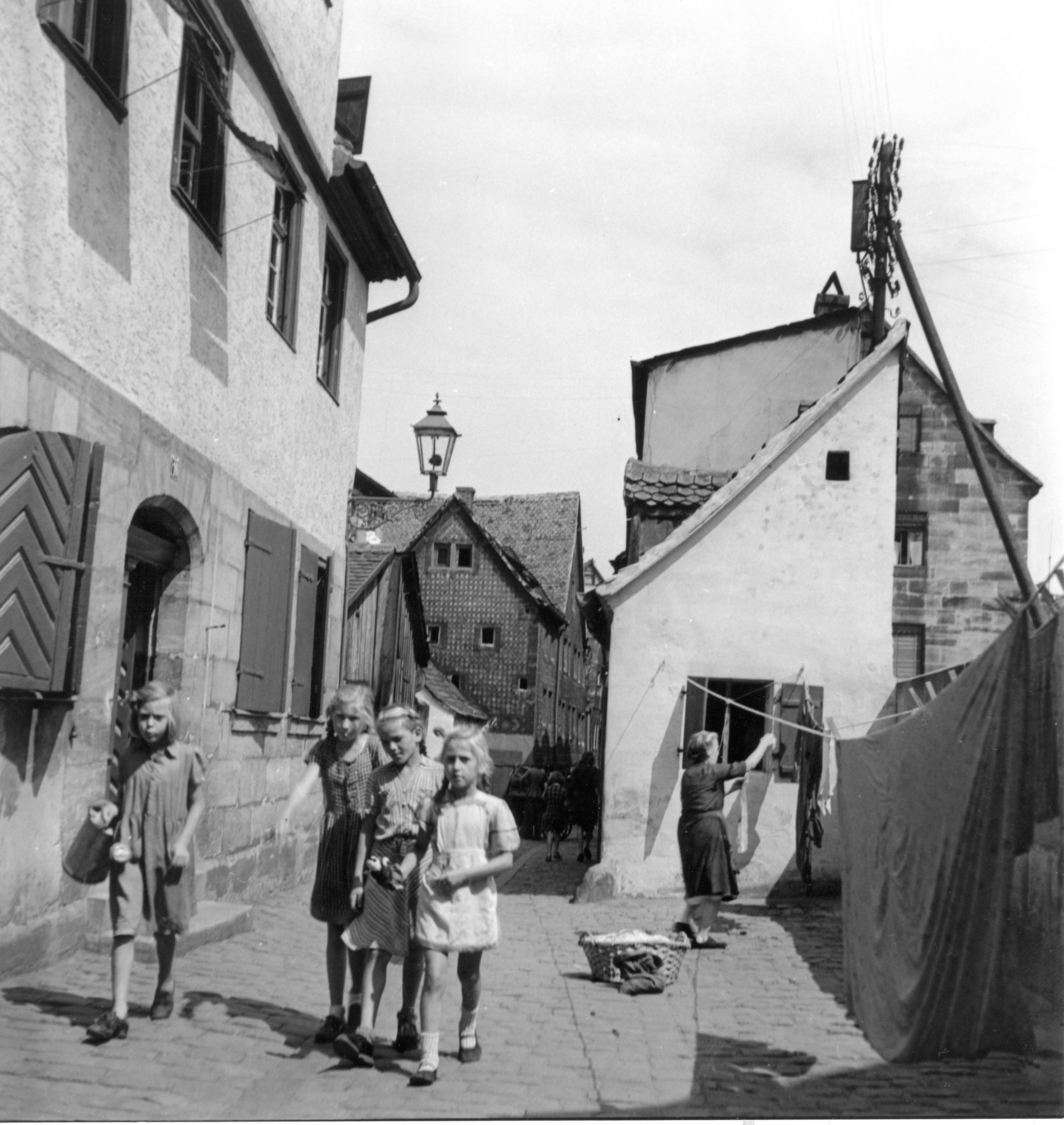 | Beschreibung | Staudengasse 16 links und 11 (Halbgiebelgebäude, Waschhaus rechts), 6 (Bildmitte verschieferter Giebel), 1952 | ||