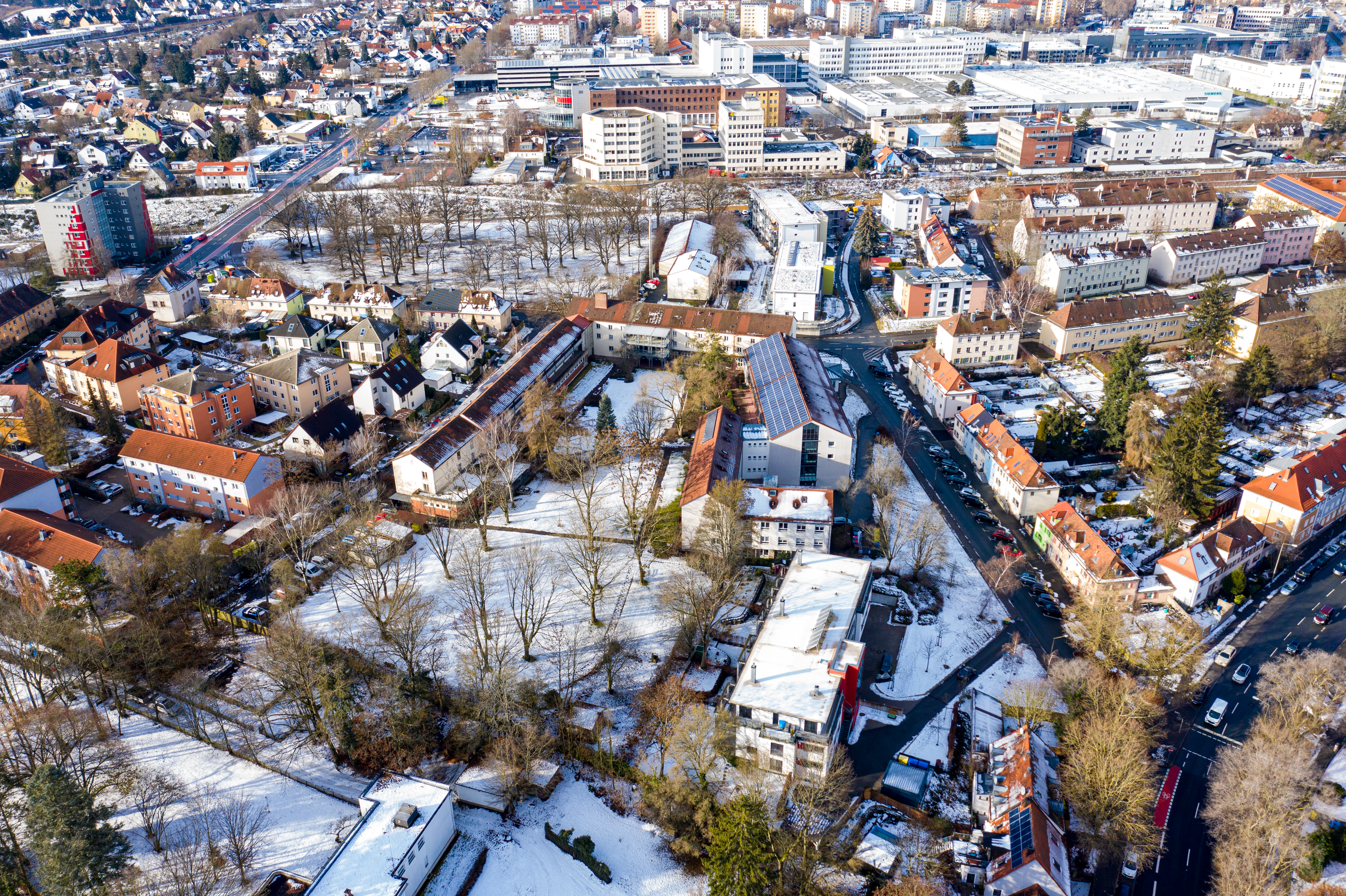 | Beschreibung | Das U-Förmige Städtische Altenpflegeheim in der Bildmitte auf der Hard - im Hintergrund Siemens und Möbelhaus Flamme, Jan. 2021 | ||