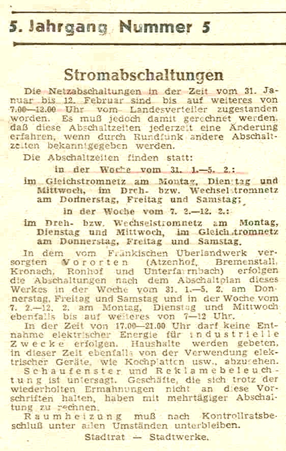 Aus: Mitteilungsblatt der Stadt Fürth und des Landrates Fürth, 5. Jahrgang / Nummer 5, Februar 1949