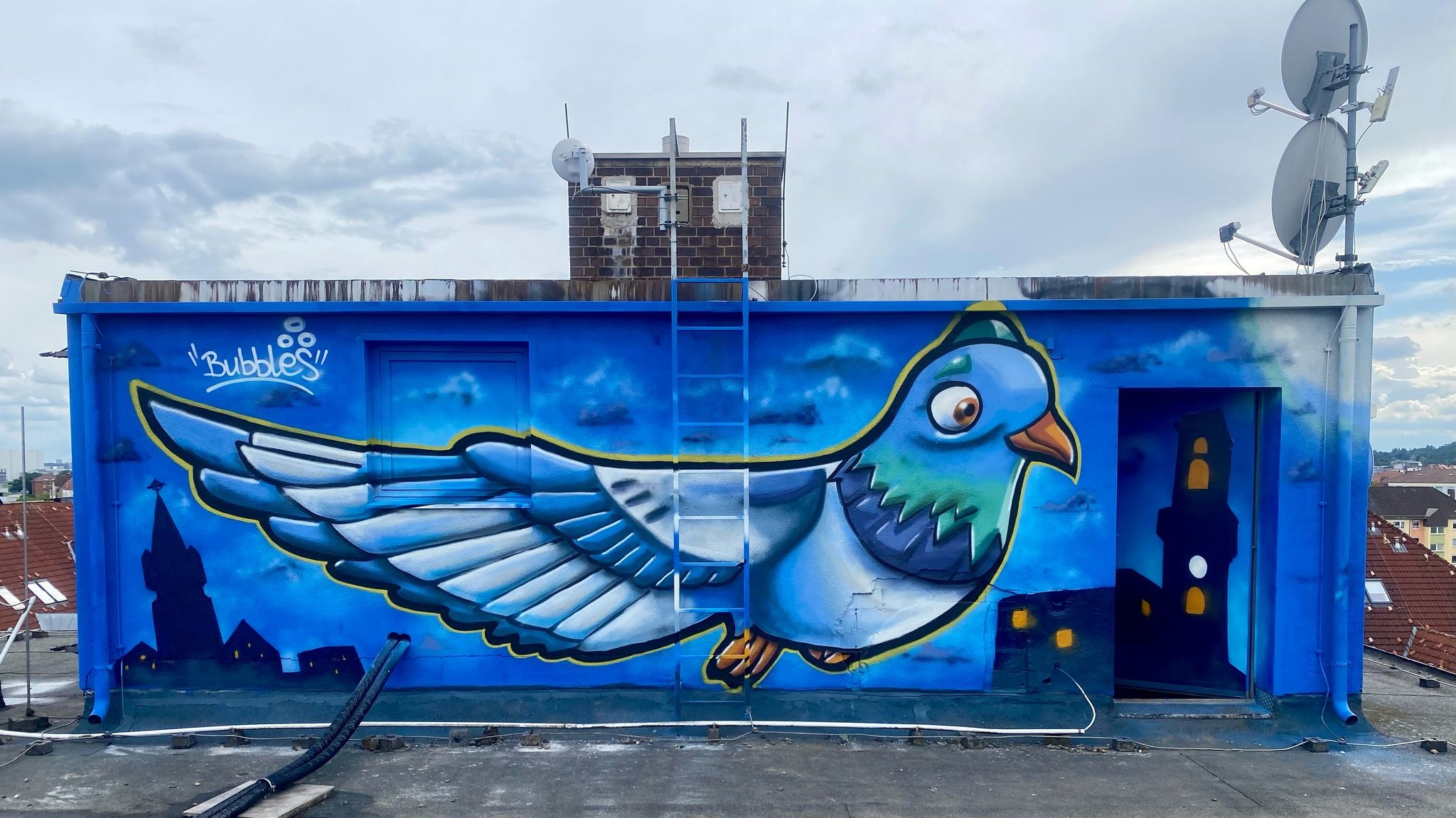 | Beschreibung | Graffiti „Blaue Taube auf dem Dach“ in der Karolinenstraße 104; Mit freundlicher Genehmigung von Herrn Sebastian Fischer, Abteilungsleitung Jugendarbeit; August 2025 | ||
