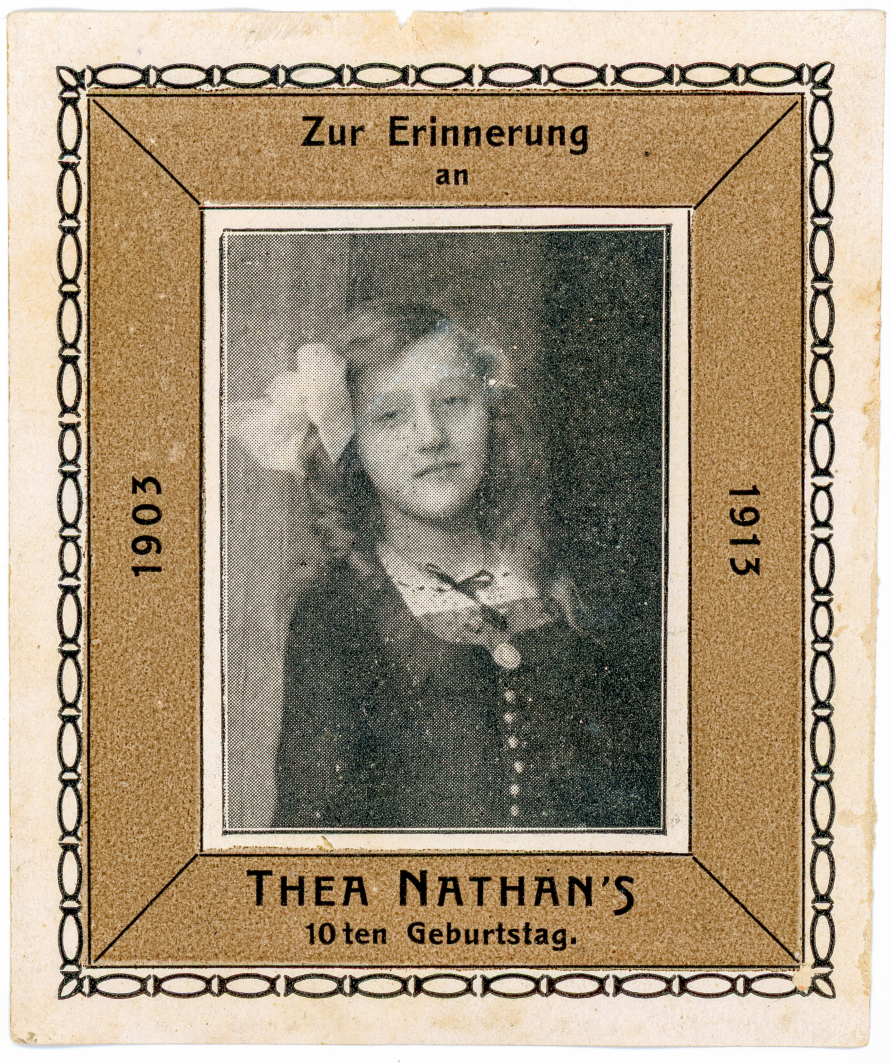 | Dateiinfo (Bild-Unterschrift und Info-Box, automatisch erstellt) | Gedenksticker Thea Irene Nathan 1903 - 1913 Urheber: unbekannt<br>Erstellungsdatum: 1913<br>Lizenz: cc-by-sa-3.0 | ||