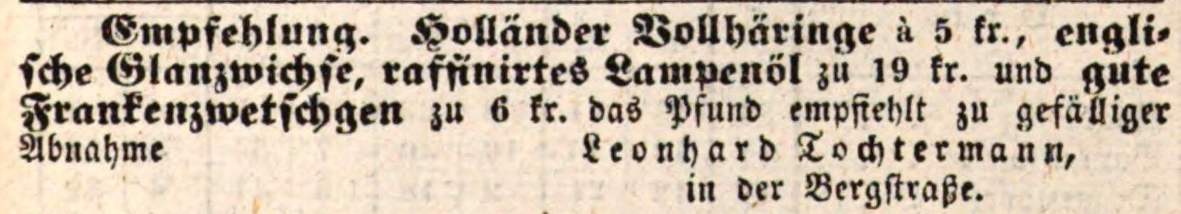 | Beschreibung | Zeitungsannonce von Leonhard Tochtermann, Dezember 1840 | ||