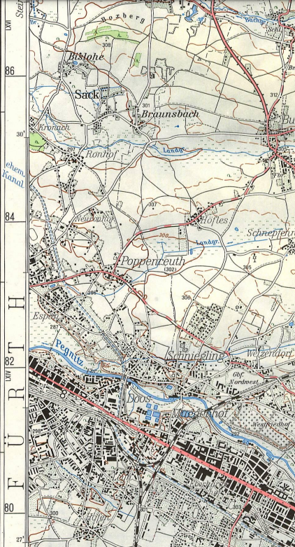 | Quellangaben | Topographische Karte 1:50000, Blatt Nürnberg L6532 - online-Digitalisat über BayernAtlas | ||