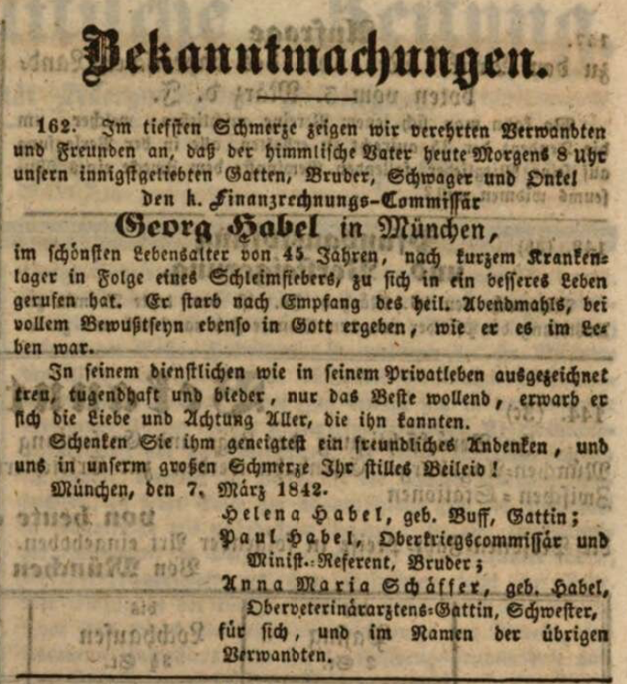 | Beschreibung | Traueranzeige für Georg Habel, München im März 1842 | ||