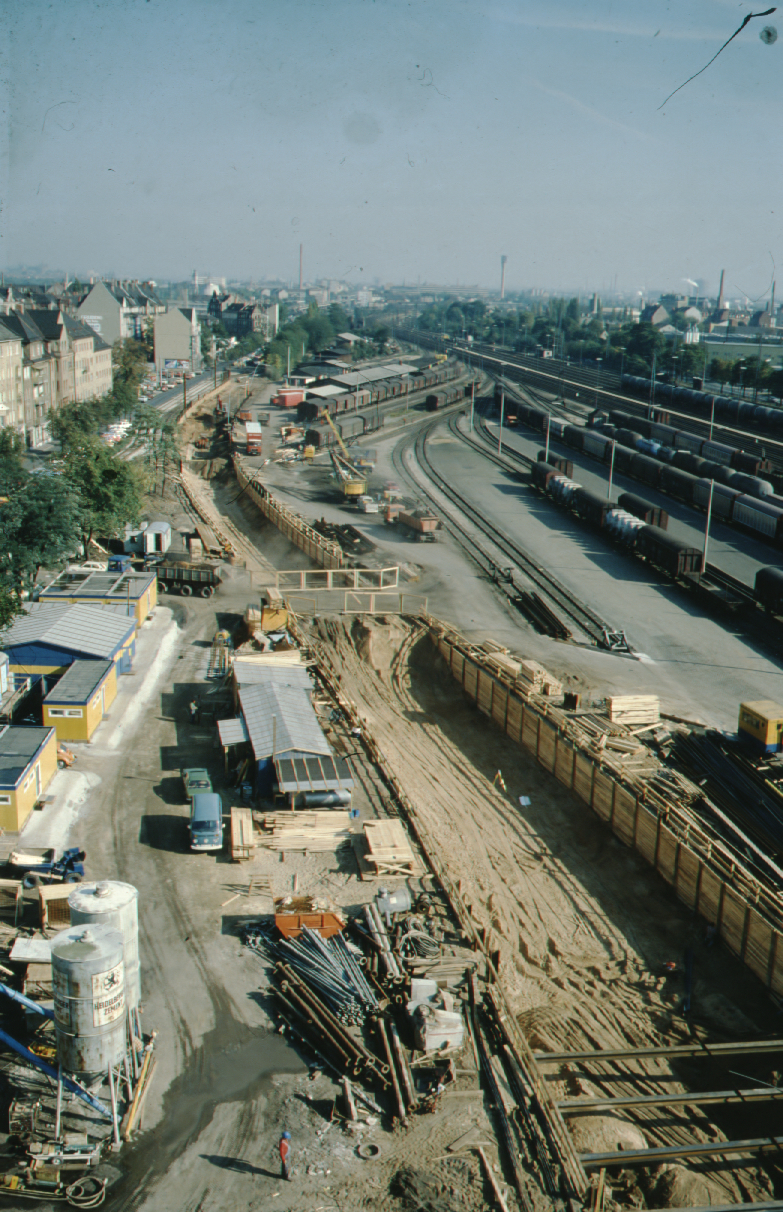 | Beschreibung | Baustelle U-Bahn, Blick vom Quelle-Frauenwohnheim Königswarterstr. 84 auf Güterbahnhof und künftige Gebhardtstraße | ||