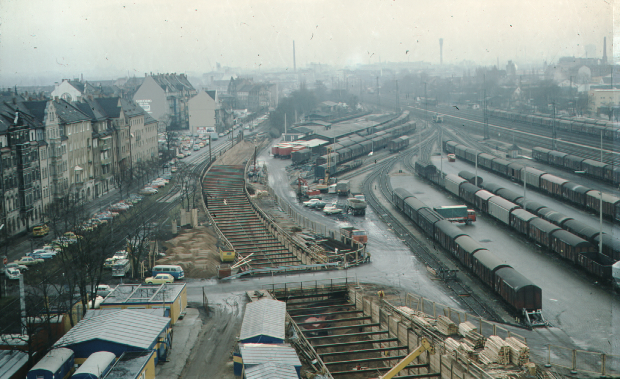 | Beschreibung | Baustelle U-Bahn, Blick Richtung Stadtgrenze auf die offene Baugrube, links die Hornschuchpromenade mit Straßenbahn-Ausweiche | ||