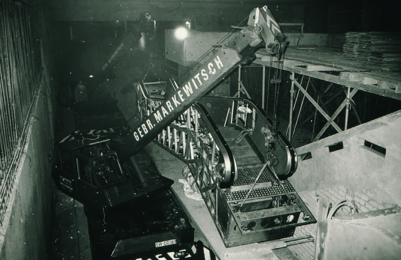 | Beschreibung | Baustelle U-Bahn, Einbringen der Rolltreppen per Autokran in den U-Bahnhof Jakobinenstraße, Aufgang zur Verteilerebene | ||