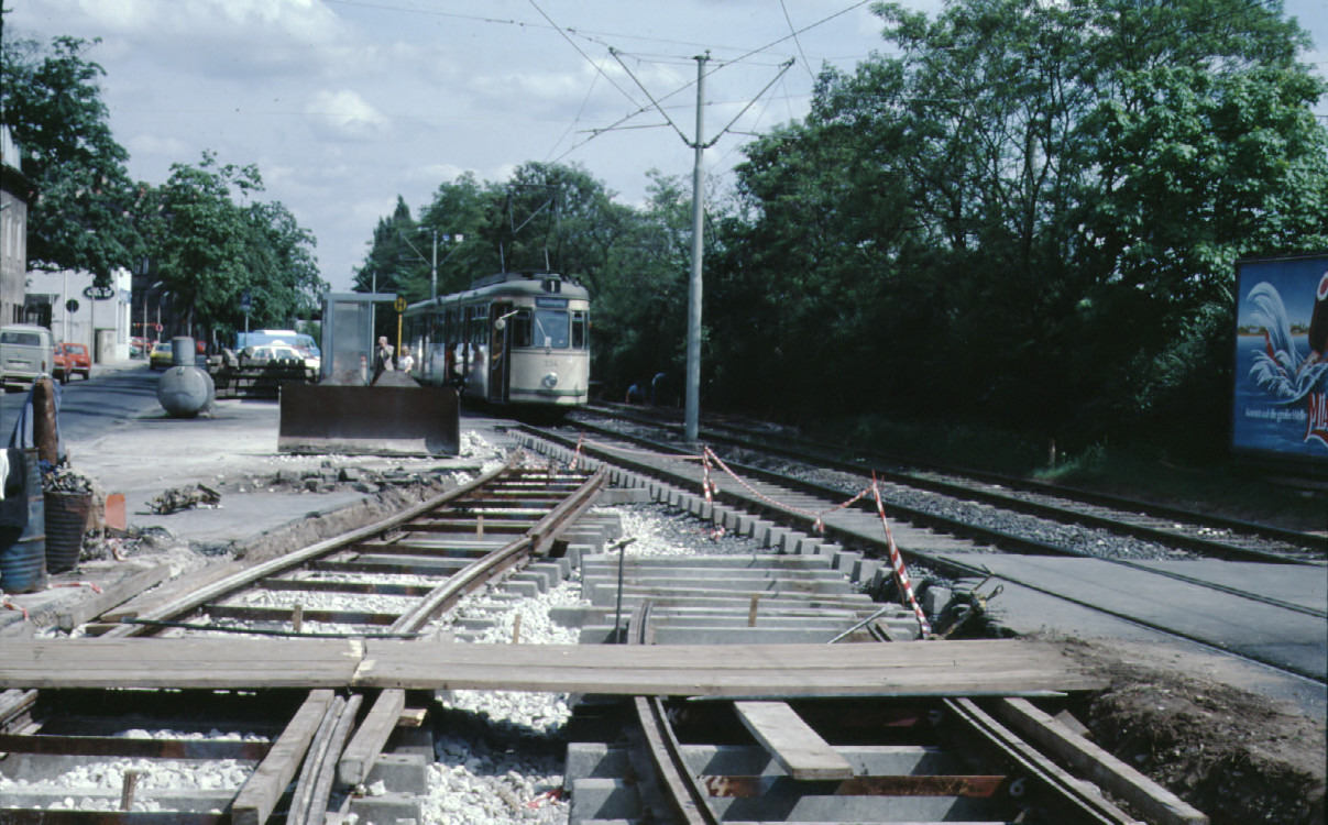 | Beschreibung | vorbereitende Arbeiten für U-Bahnbau, Haltestelle Lobitzstr., Verlegung der Straßenbahngleise, Mai 1979 | ||
