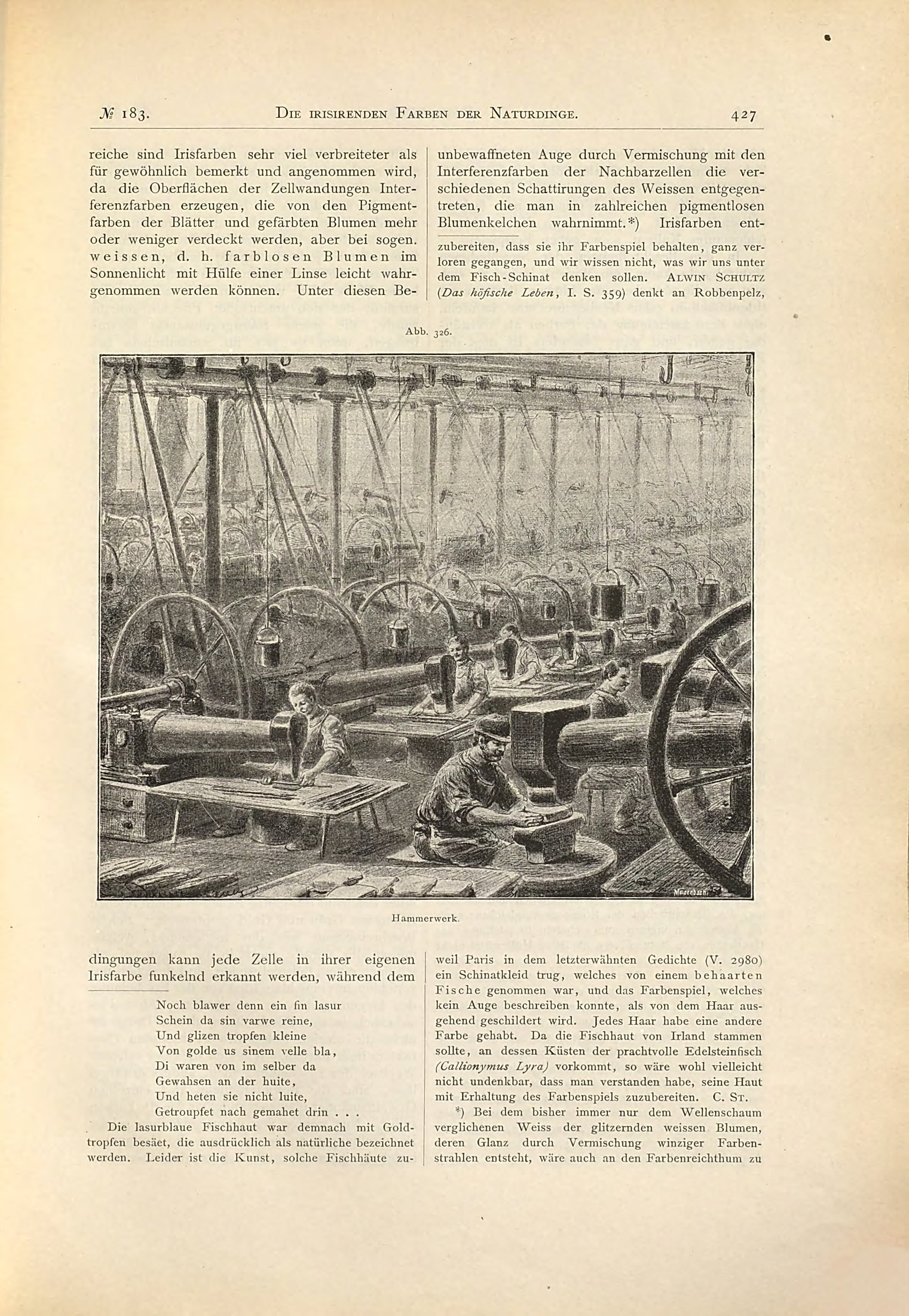 | Beschreibung | Beschreibung der Blattmetall- und Bronzefarbenfabrikation in Fürth in der Zeitschrift Prometheus. Die gezeigten Abbildungen stammen ursprünglich aus einer Denkschrift, die das Unternehmen Bernhard Ullmann & Co. im gleichen Jahr selbst herausgegeben hat. | ||