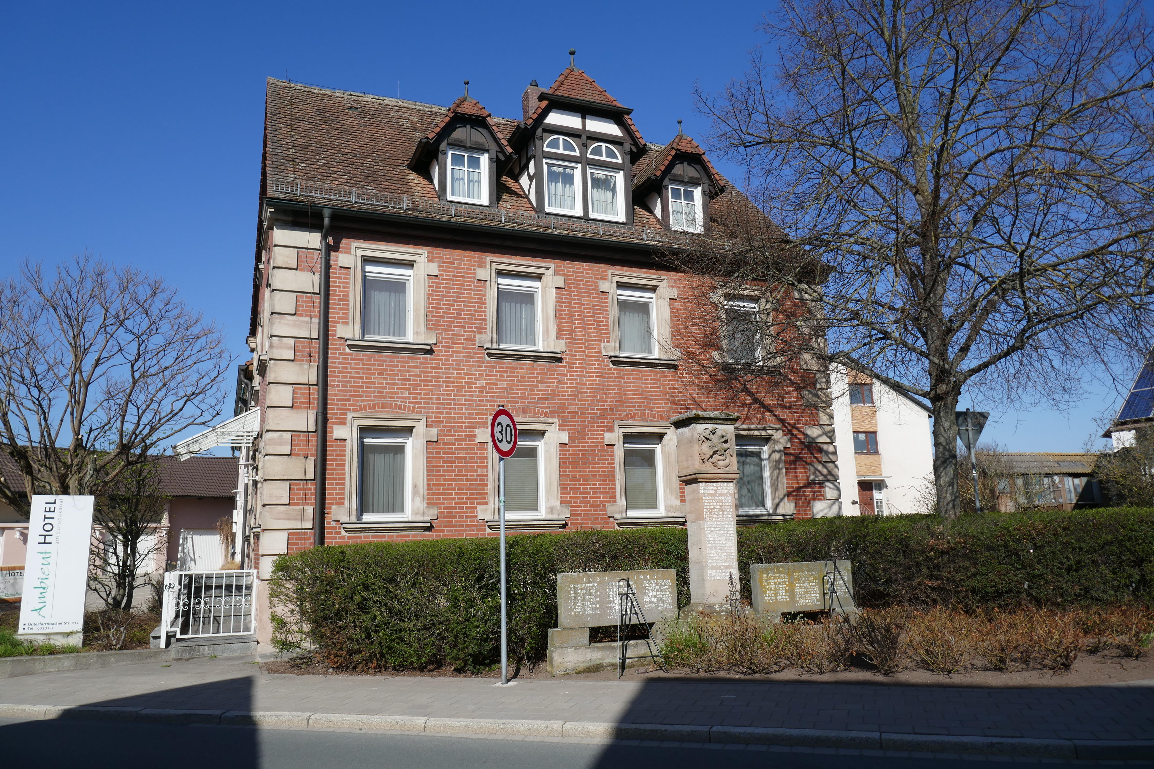 | Beschreibung | Das Ambient-Hotel in Unterfarrnbach, davor das Kriegerdenkmal, 2021 | ||