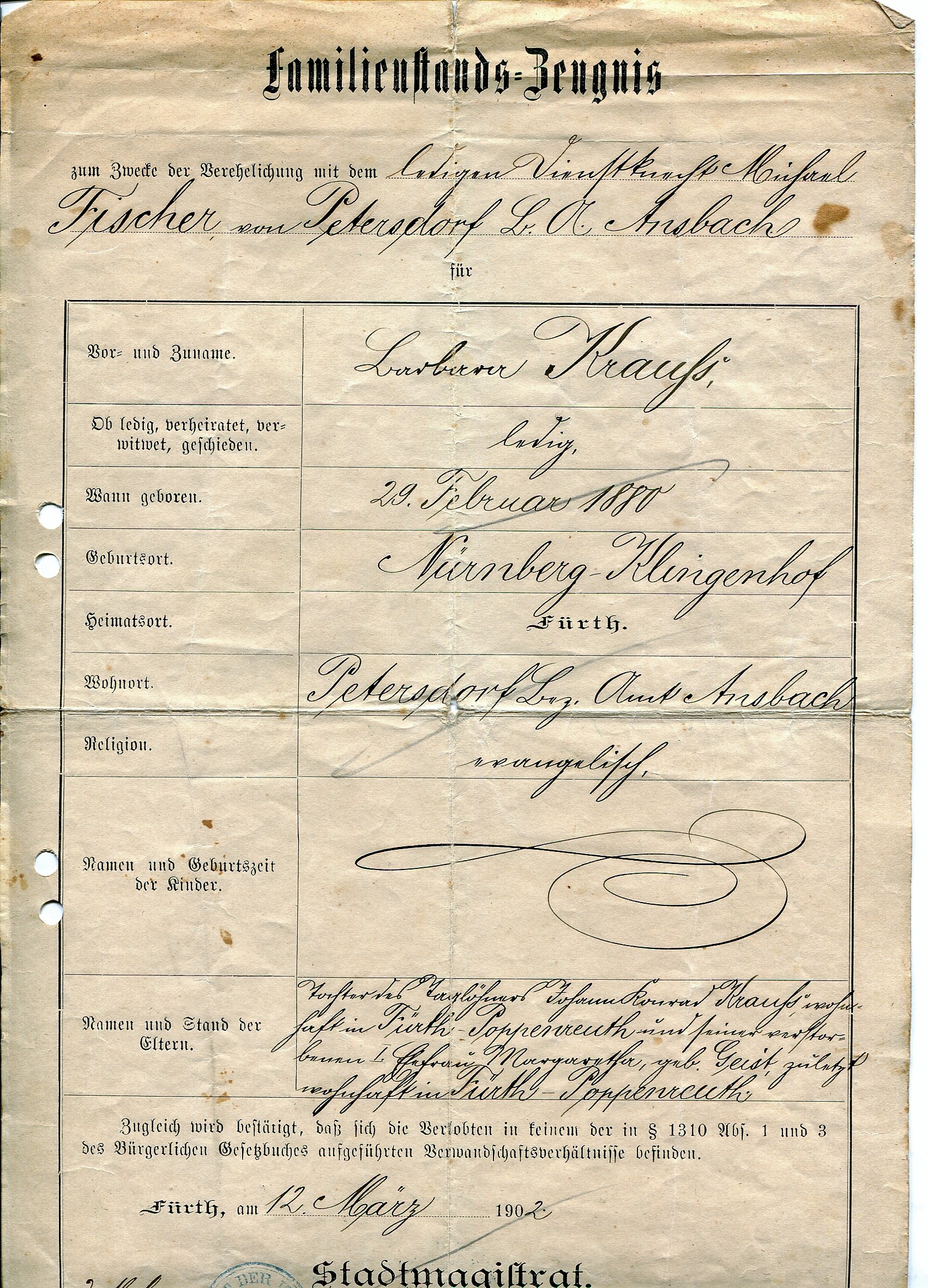 | Beschreibung | Urkunde Stadtmagistrat Fürth von 1902 mit Dienstsiegel Teil 1 | ||