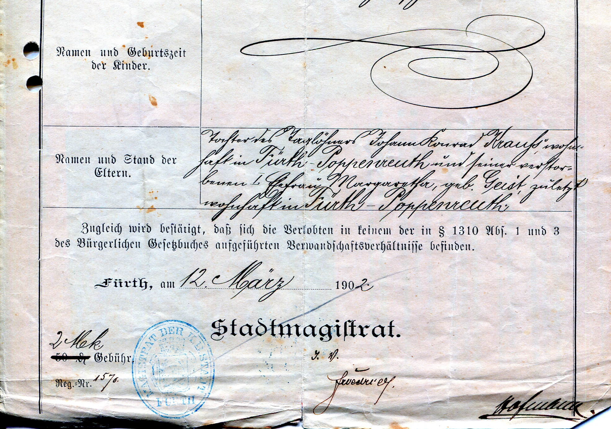 Urkunde Stadtmagistrat Fürth von 1902 mit Dienstsiegel Teil 2