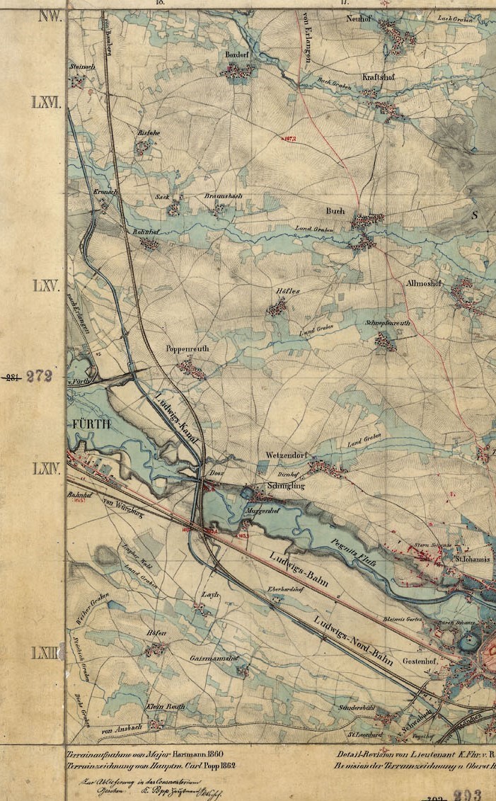 | Dateiinfo (Bild-Unterschrift und Info-Box, automatisch erstellt) | Ausschnitt aus dem Urpositionsblatt "Nürnberg", 1860-1862 (Maßstab 1:25 000) Urheber: Hartmann, Carl Popp, Fhr. v. Reitzenstein, v. Schintling, Grf. v. Holnstein<br>Erstellungsdatum: 1860<br>Lizenz: cc-by-sa-4.0 | ||