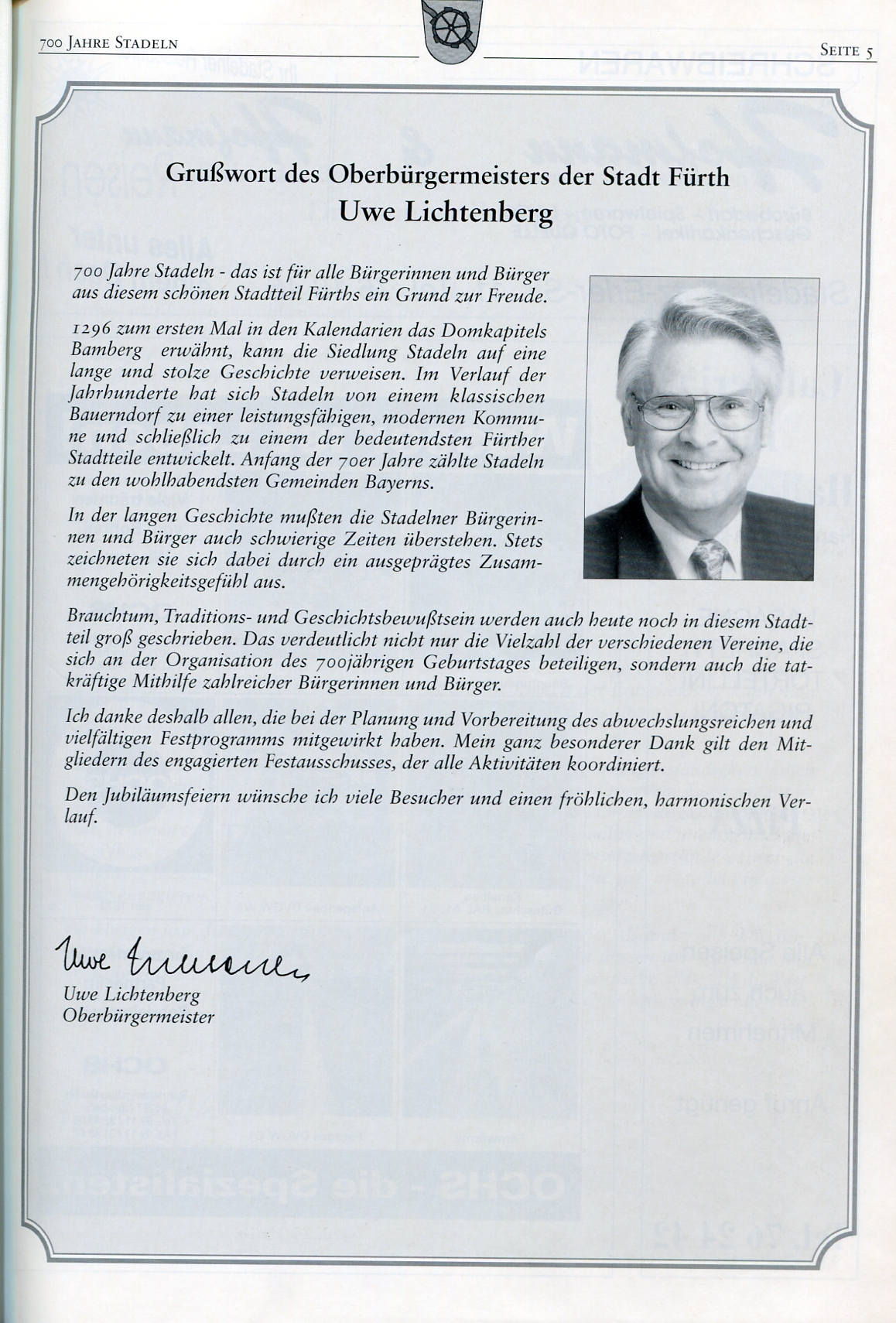 Grußwort von OB Uwe Lichtenberg in der Festschrift "700 Jahre Stadeln" 1996