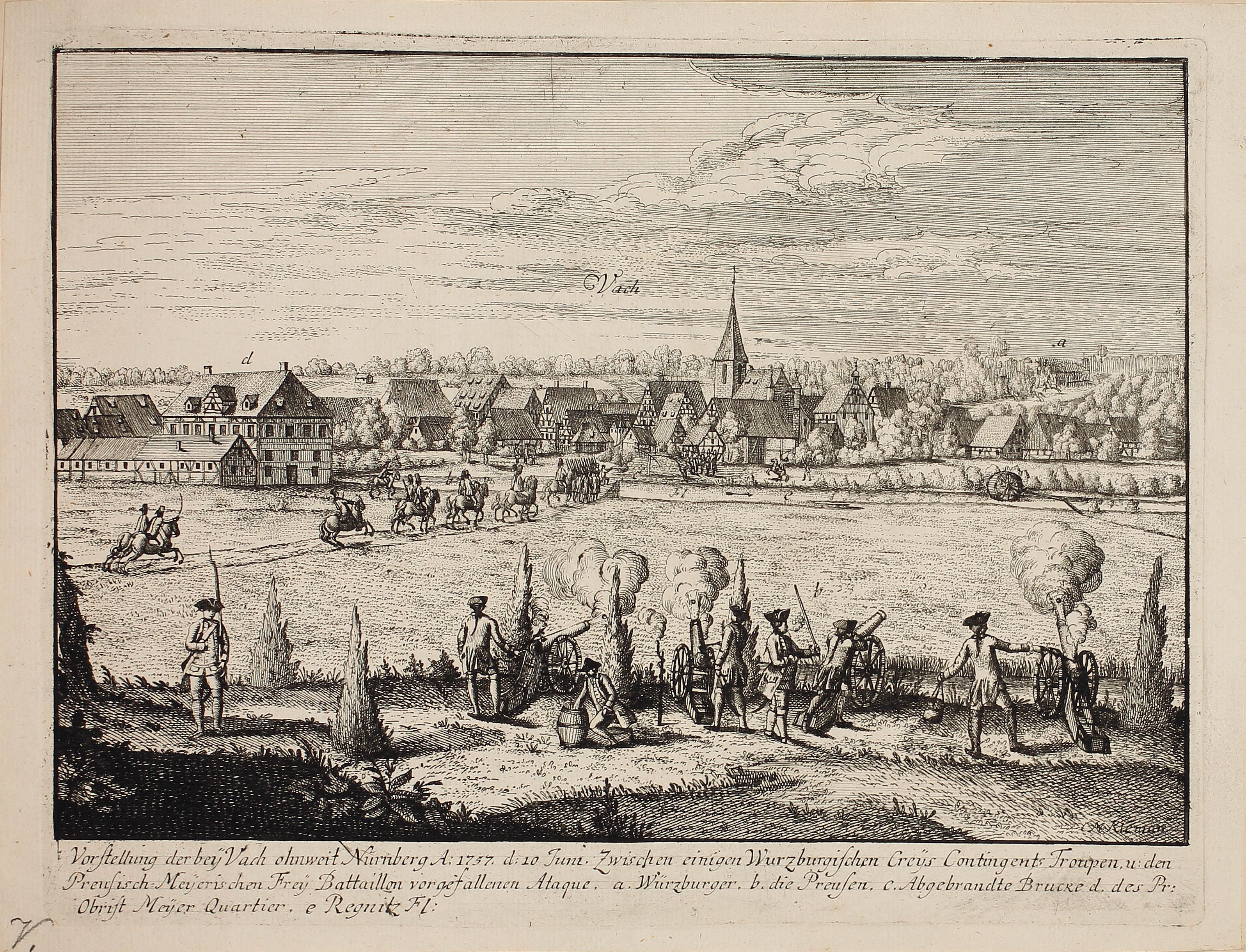 | Beschreibung | Vorstellung der beÿ Vach ohnweit Nürnberg A: 1757 d: 10. Juni ... vorgefallenen Ataque | ||