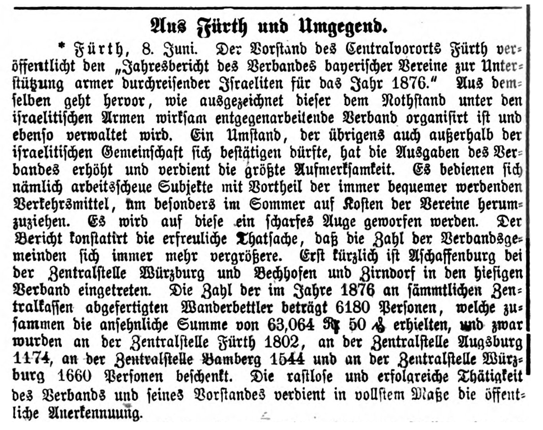 | Beschreibung | Bericht zum Verein durchreisender Israeliten, Fürther Tagblatt 9.Juni 1877 | ||
