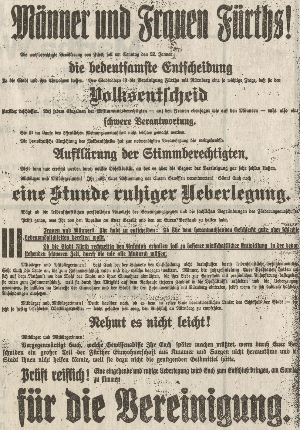 | Beschreibung | Zeitungsanzeige für die Eingemeindung von Fürth nach Nürnberg am 21. Januar 1922 | ||